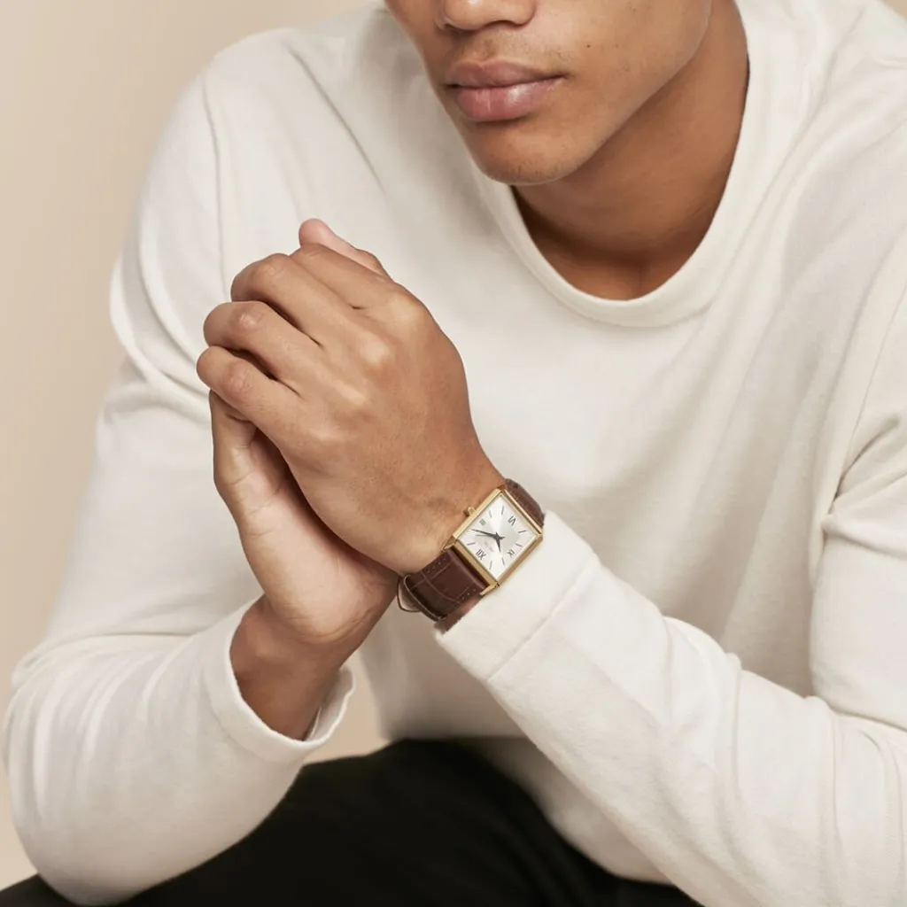 Montre Arctik Quark Alliage Doré Rectangulaire Quartz 29×40.5mm Fond Argenté Bracelet Cuir Vache Effet Alligator Marron P101074-a