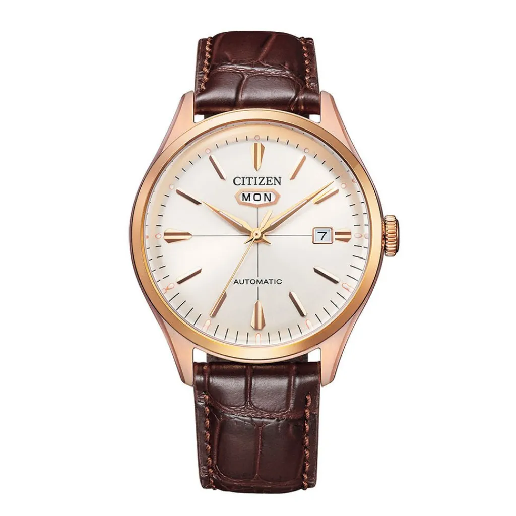 Montre Citizen C7 Mechanical Acier Doré Ronde 40.2mm Automatique Fond Blanc Bracelet Cuir De Veau Marron Nh8393-05ae