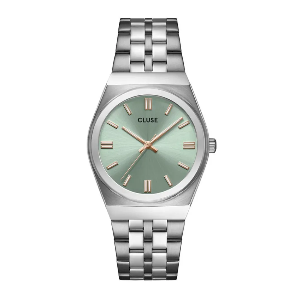 Montre Cluse Retro 70’s Acier Inoxydable Argenté Ronde Quartz 40x33mm Fond Vert Bracelet Acier Inoxydable Argenté Cw35103