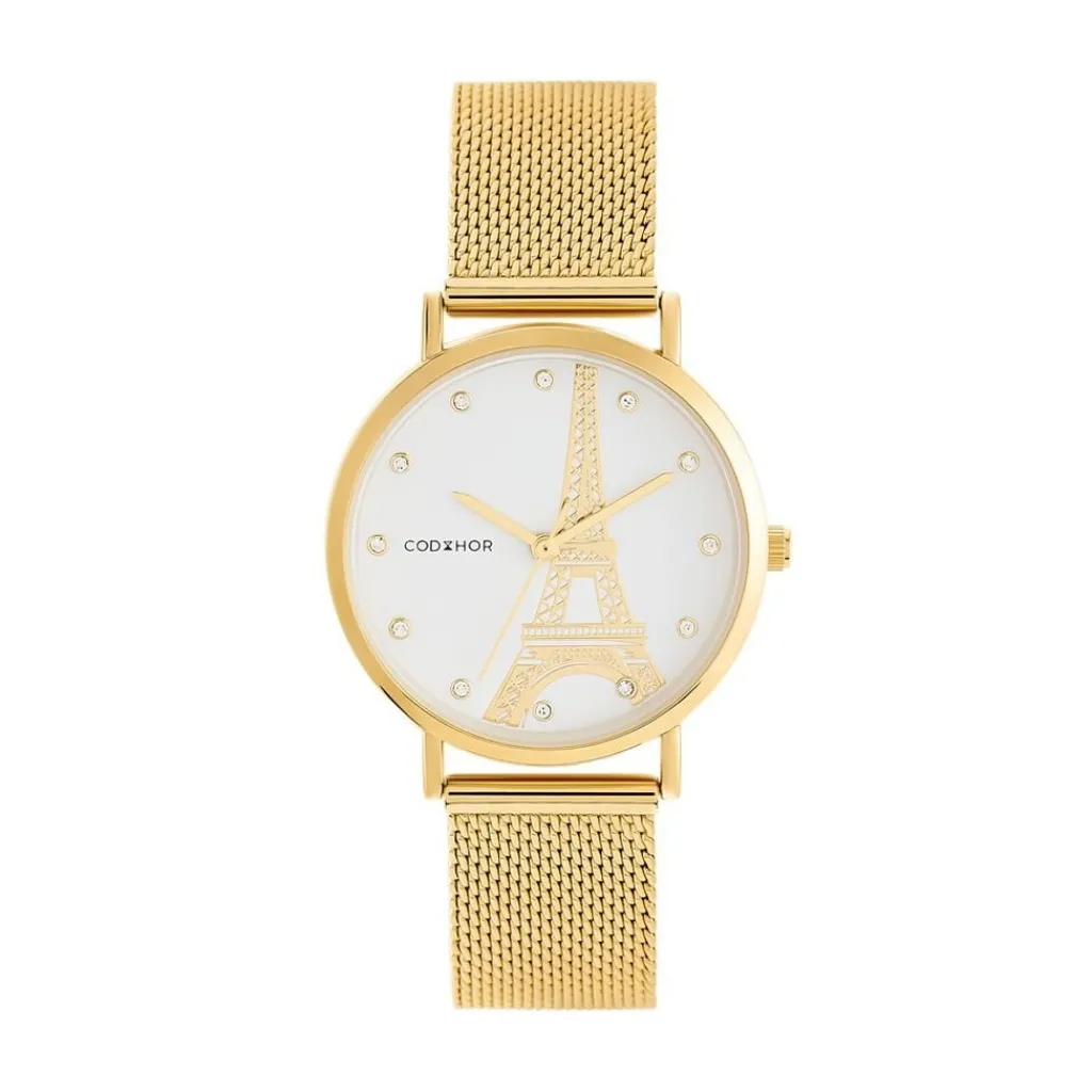 Montre Codhor Monument Alliage Doré Ronde Quartz 33mm Fond Blanc Monument Bracelet Milanais Acier Doré P100881-at