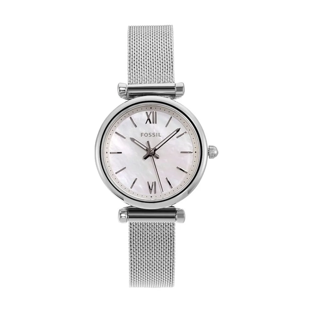 Montre Fossil Carlie Mini Acier Blanc Ronde Quartz 28mm Fond Nacre Blanc Bracelet Acier Blanc Es4432
