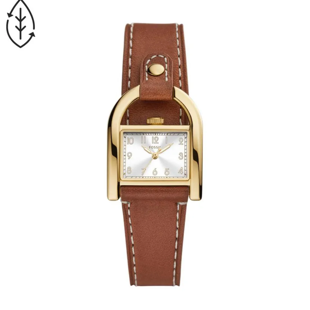 Montre Fossil Harwell Acier Doré Rectangulaire Quartz 28mm Fond Blanc Bracelet Cuir Marron Es5264