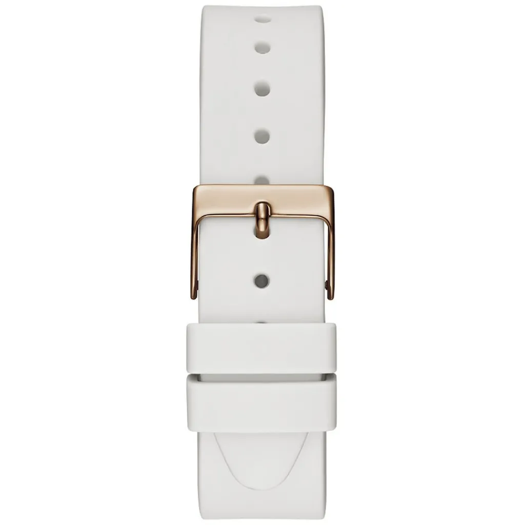 Montre Guess Anna Acier Doré Rose Ronde Quartz 38mm Fond Blanc Lunette Strass Bracelet Silicone Blanc Gw0359l2