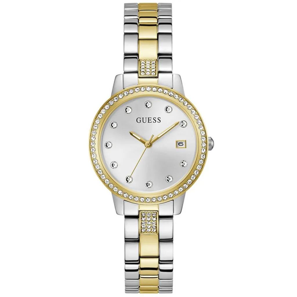 Montre Guess Heartless Acier Bicolore Doré Blanc Ronde Quartz 34mm Lunette Strassée Fond Argenté Bracelet Acier Bicolore Doré Blanc Gw0725l1