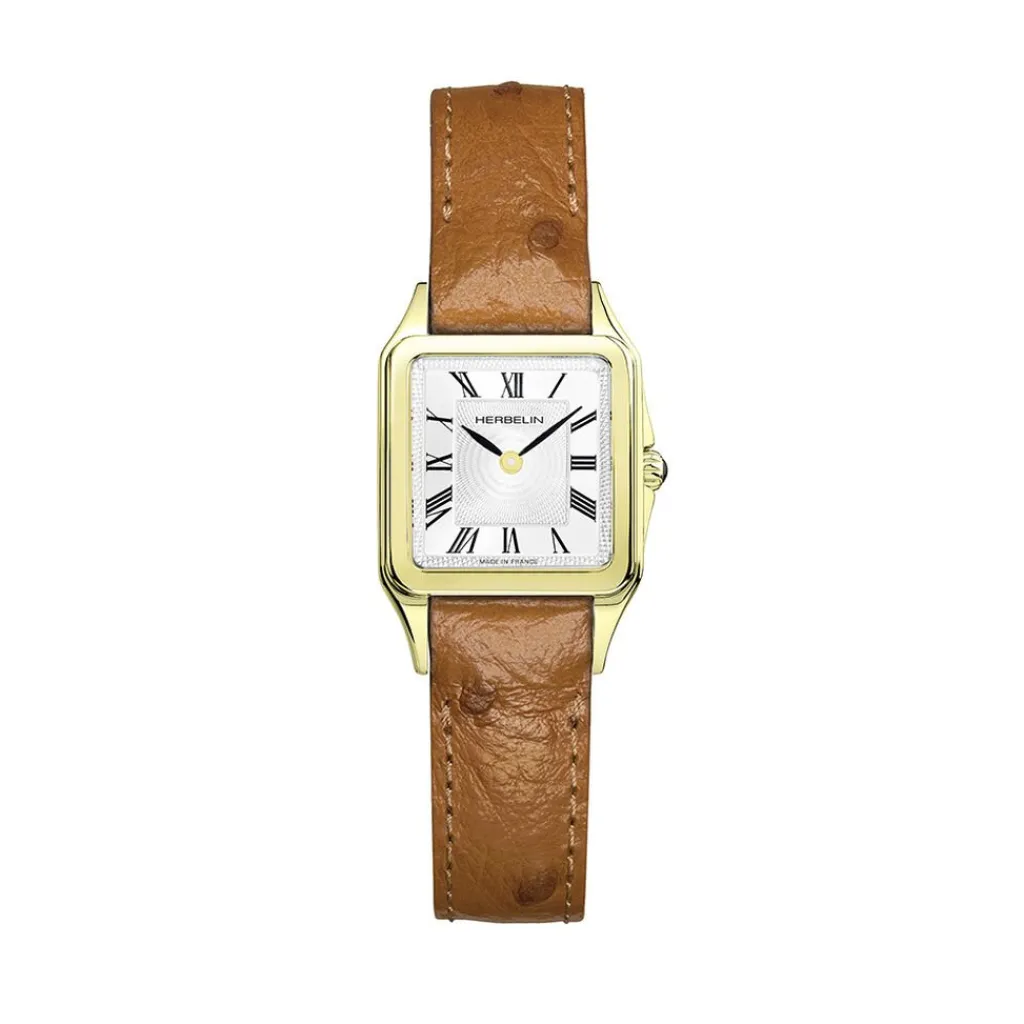 Montre Herbelin Luna Acier Dore Carre Quartz 24mm Fond Argente Bracelet Cuir De Veau Marron 17457p01gd