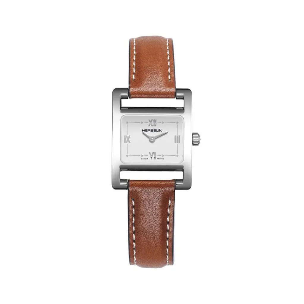 Montre Herbelin V Eme Avenue Acier Argente Rectangulaire Quartz 19×23.4mm Fond Blanc Bracelet Cuir De Veau Marron 17537ap01gd