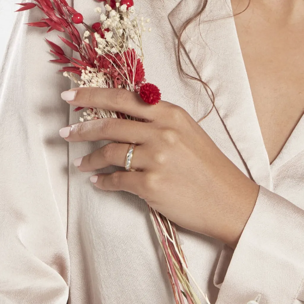 Alliance Or Bicolore 750/1000 Blanc Et Jaune Fantaisie Ruban Satine Motif Feuilles Ciselees 4mm