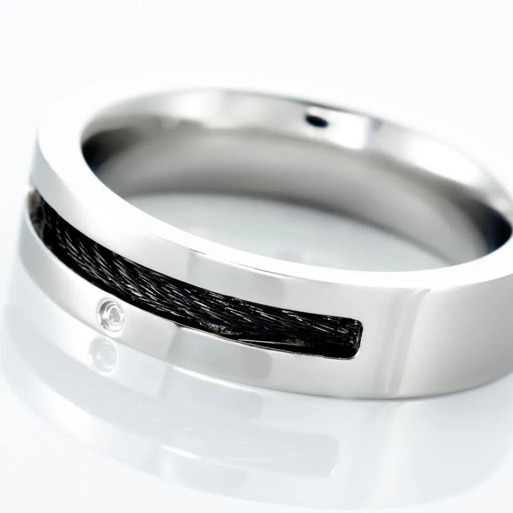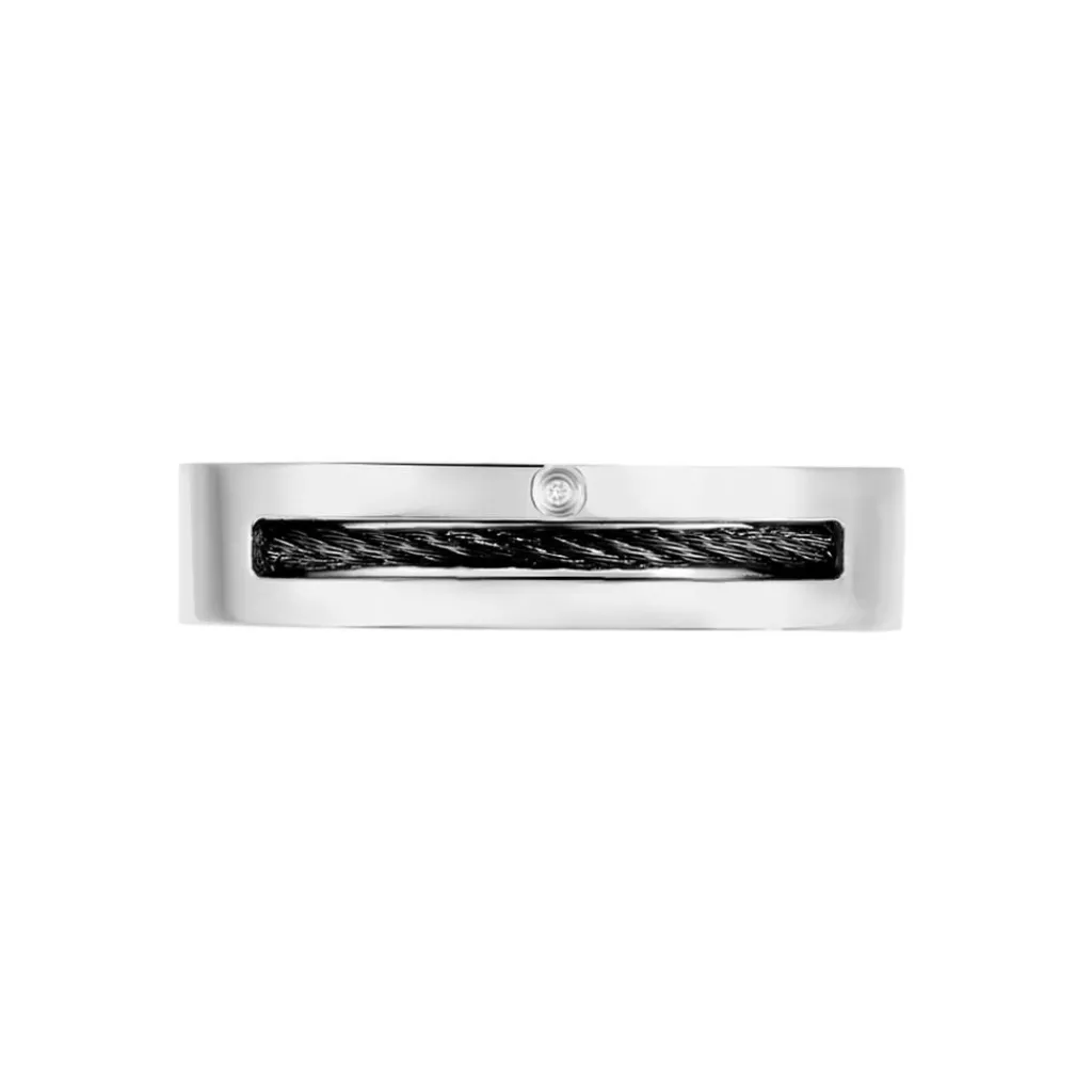 Bague Acier Blanc Diamant Blanc 0.005 Cts Et Cable Noir