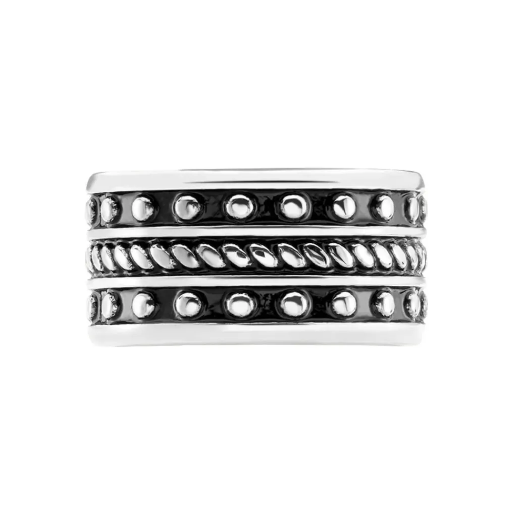 Bague Argent Blanc 925/1000 Anneau Large Motifs Pointilles Email Noir