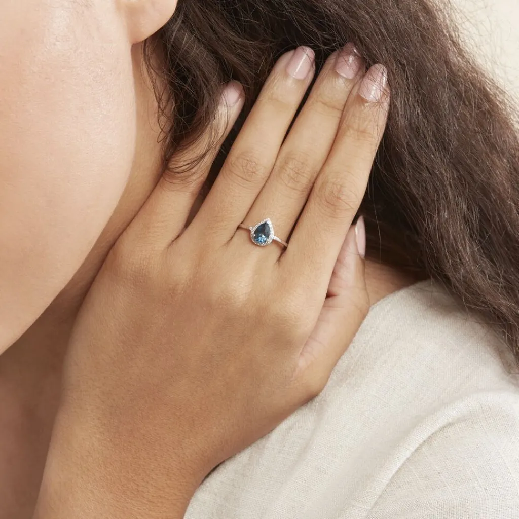 Bague Or Blanc 375/1000 Forme Poire London Blue Topaze Et Entourage Oxydes De Zirconium