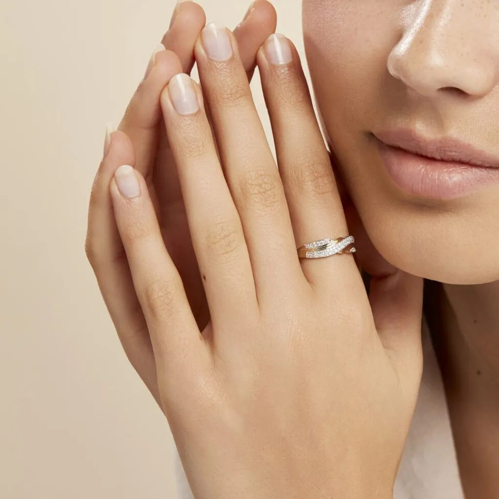 Bague Or Jaune 375/1000 Bandeau Croisé Oxydes De Zirconium Micro Serti Pm
