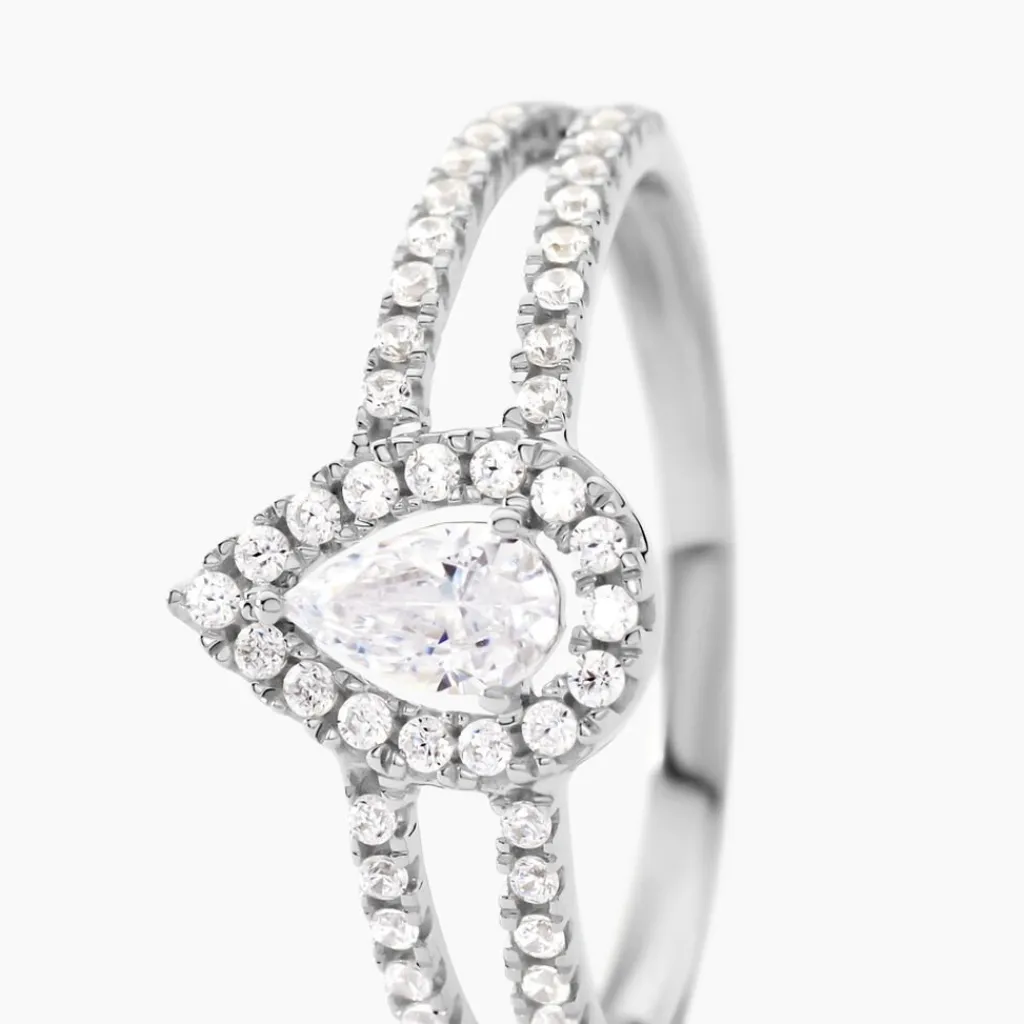 Bague Or Blanc 375/1000 Oxyde De Zirconium Central Forme Poire Accompagne Oxydes De Zirconium