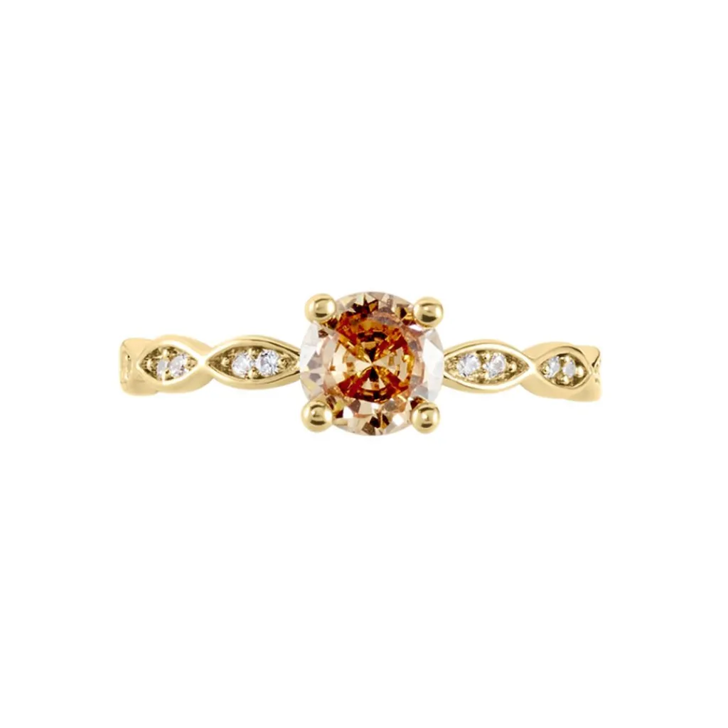 Bague Plaqué Or Jaune Solitaire Oxyde De Zirconium Champagne 4 Griffes Pavage Oxydes De Zirconium