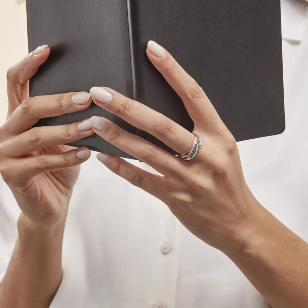 Bague Or Blanc 375/1000 Vagues Croisées Pavage Diamants Blancs Diamants Noirs