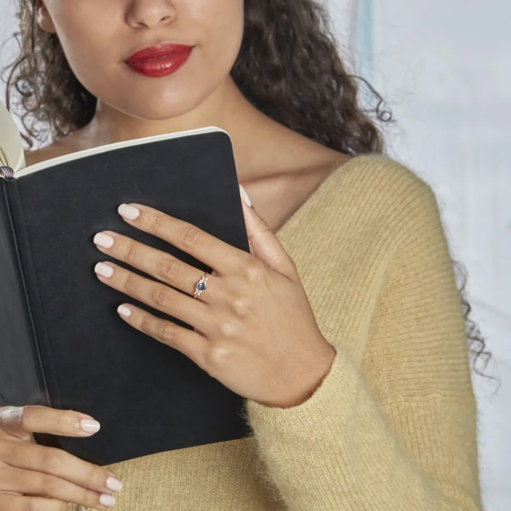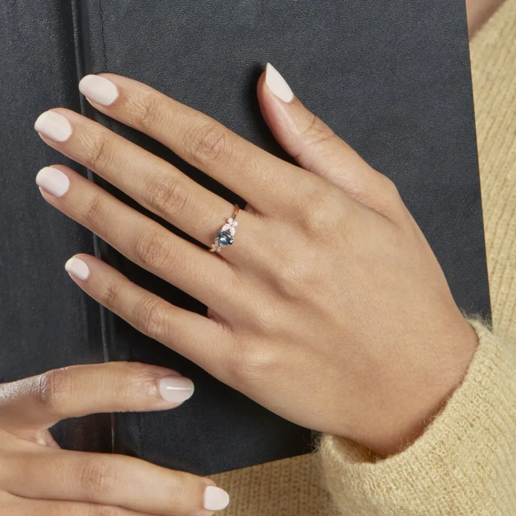 Bague Or Rose 375/1000 Topaze Ovale London Blue Serti Griffes Accompagne Oxydes De Zirconium Style Papillon