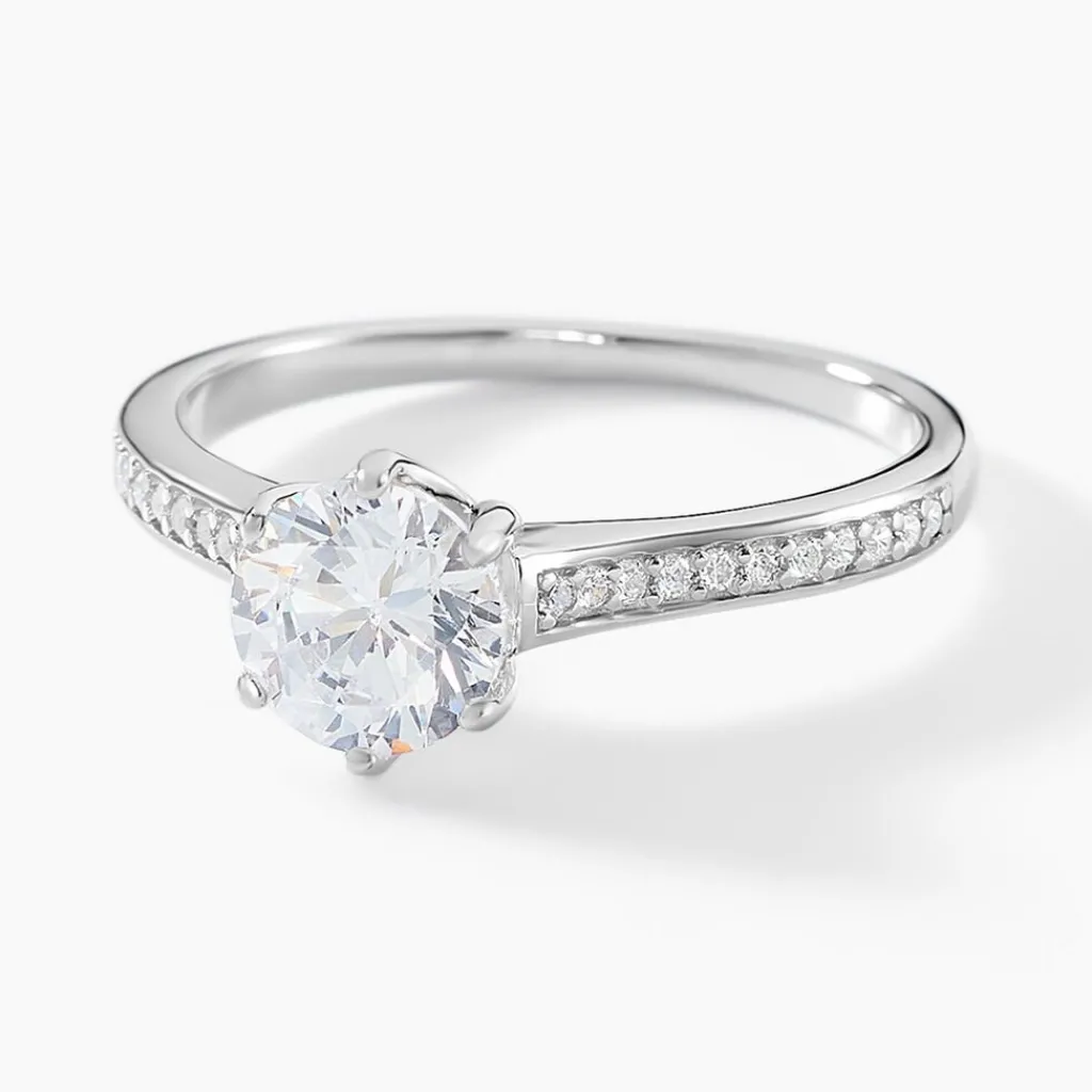 Bague Solitaire Argent Blanc 925/1000 Oxyde De Zirconium Central Accompagné Oxydes De Zirconium