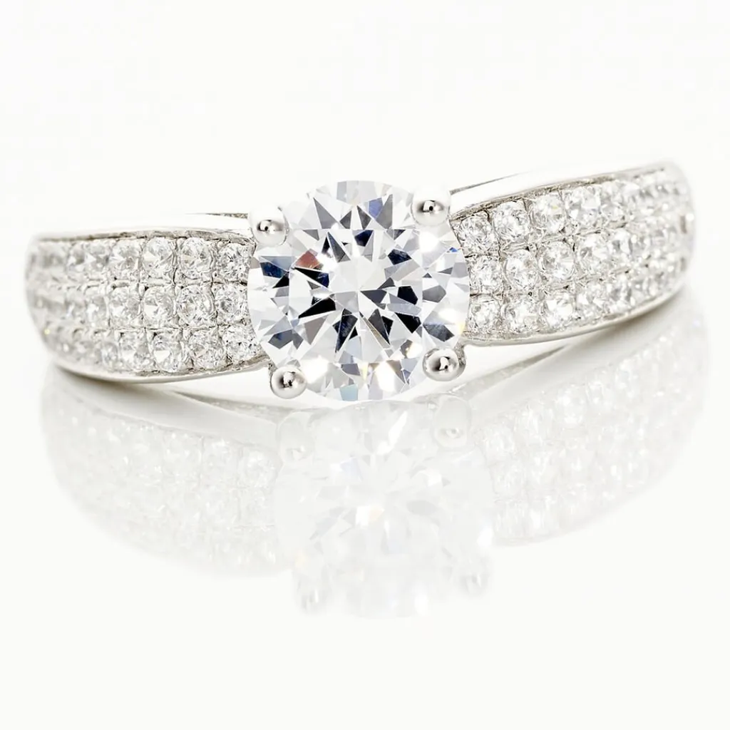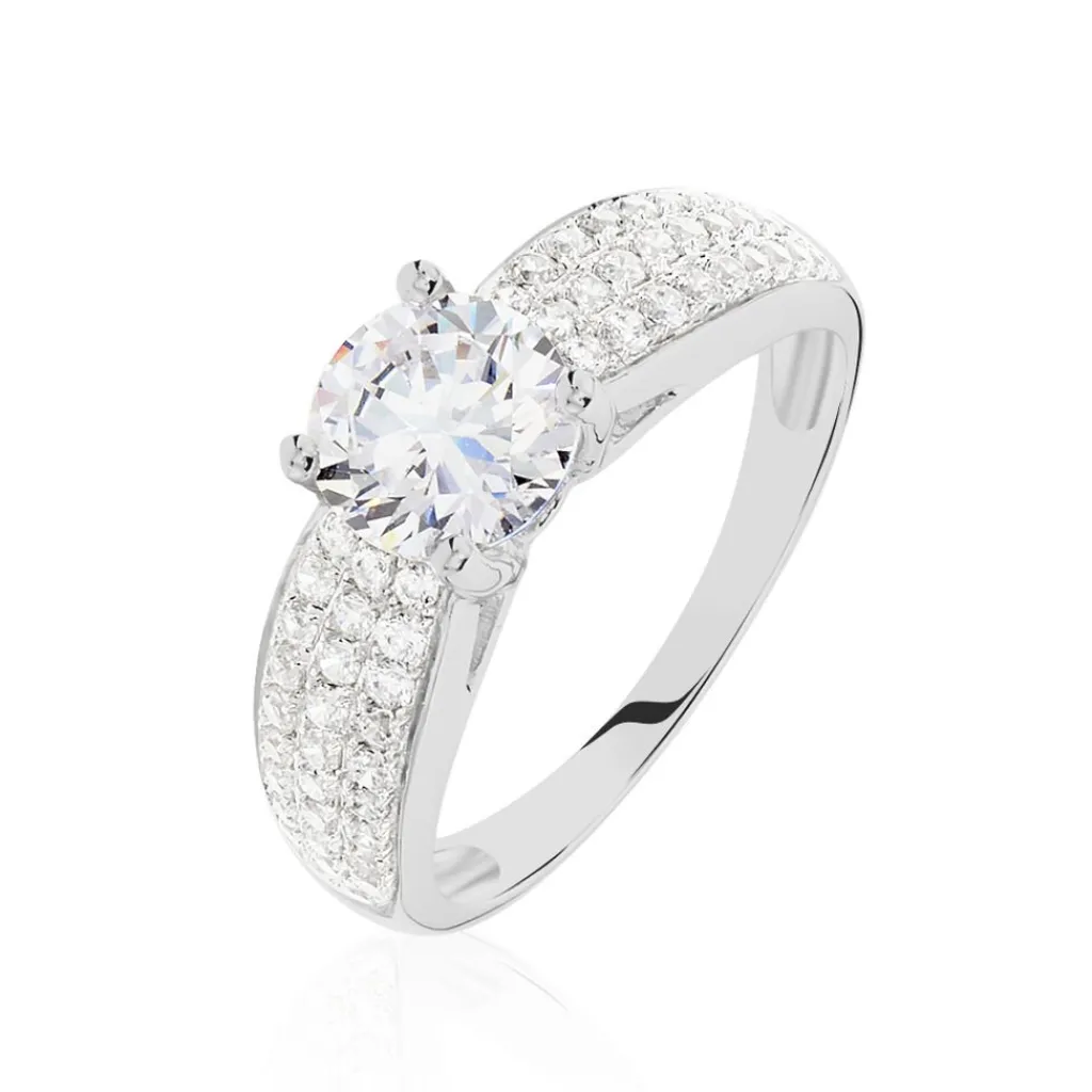Bague Argent Blanc 925/1000 Oxyde De Zirconium Central Forme Ronde Pavage Oxyde De Zirconium