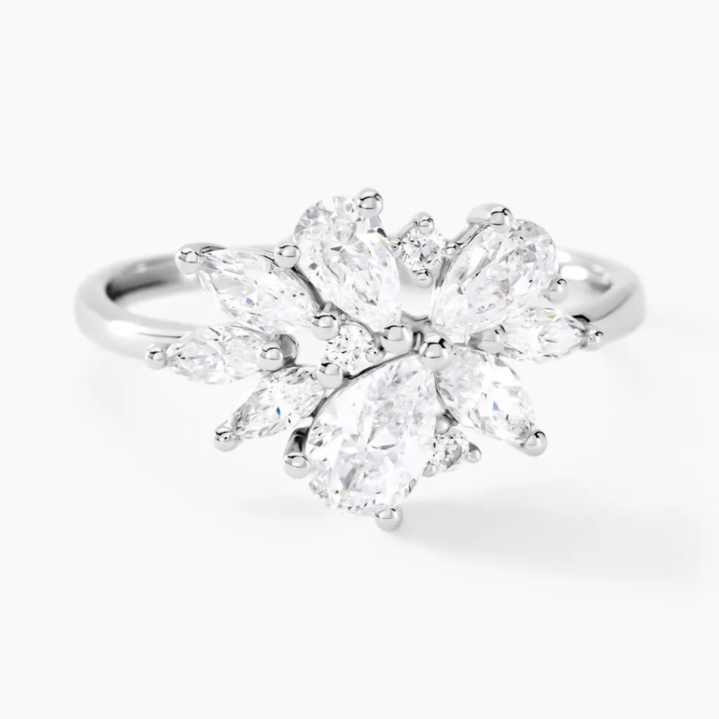 Bague Fleur Or Blanc 375/1000 Multipierres Gouttes Et Navettes Oxydes De Zirconium Serti Griffes