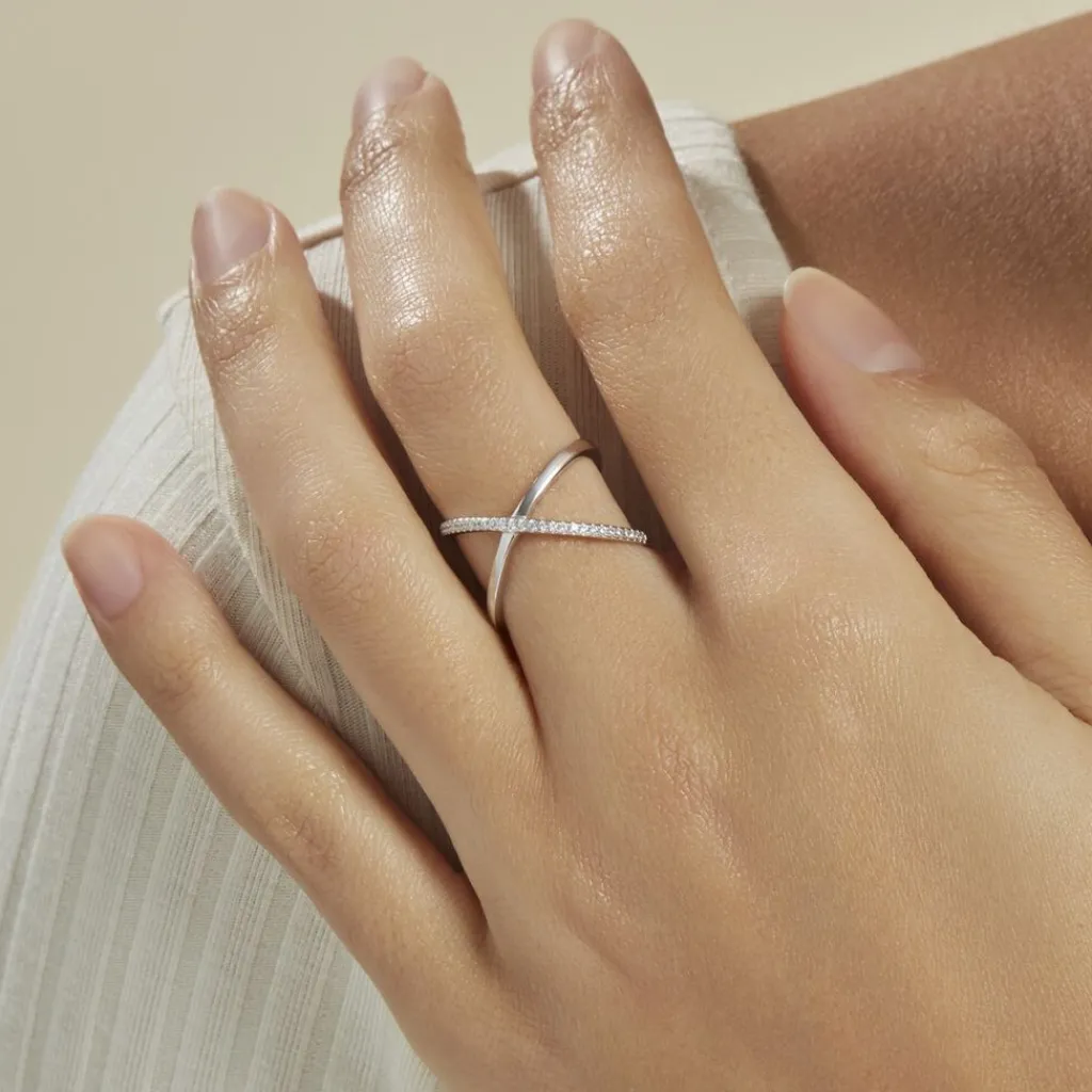 Bague Argent Blanc 925/1000 Deux Anneaux Croises Oxydes De Zirconium