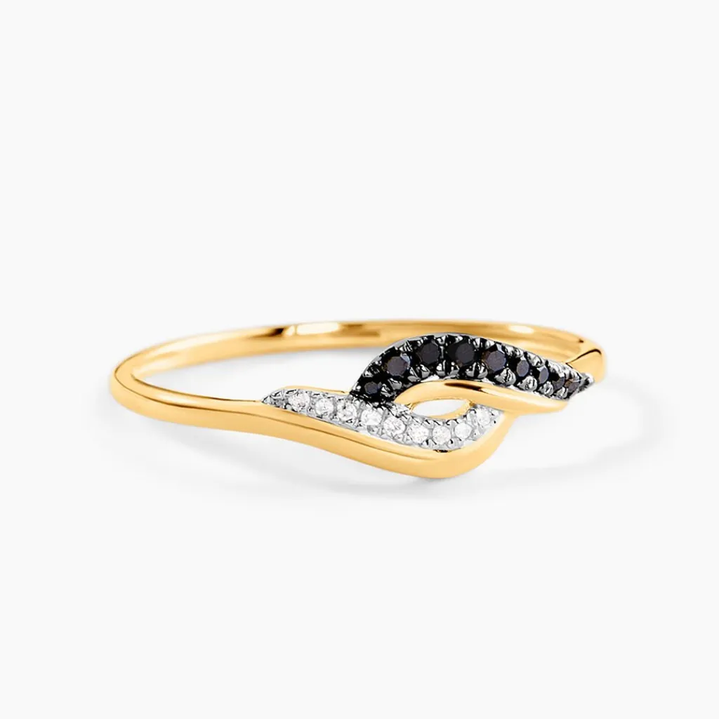 Bague Or Jaune 375/1000 Vague Diamants Blancs Et Noirs Micro Serti