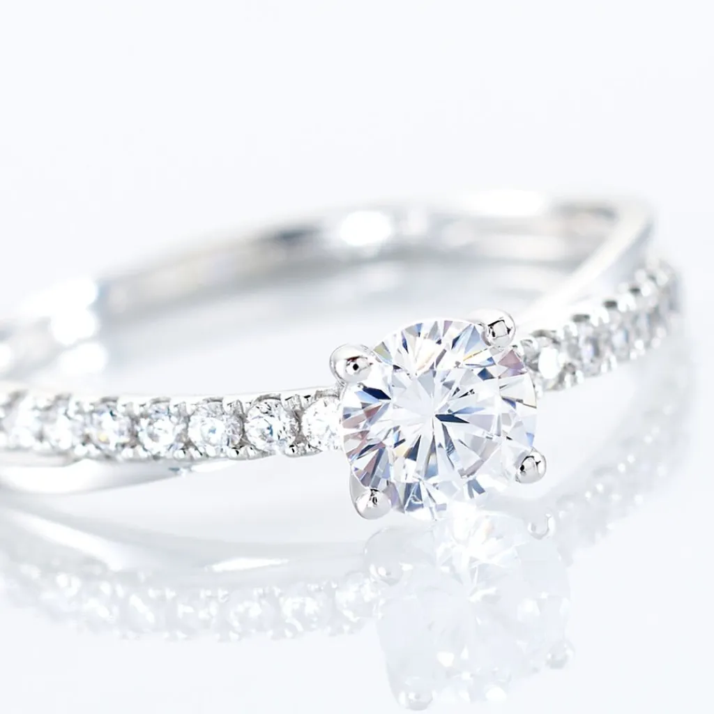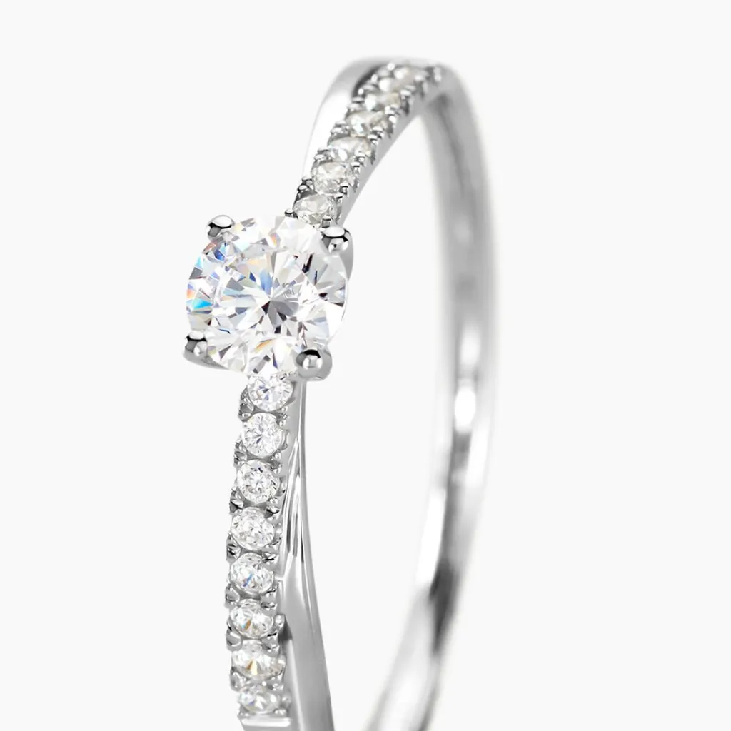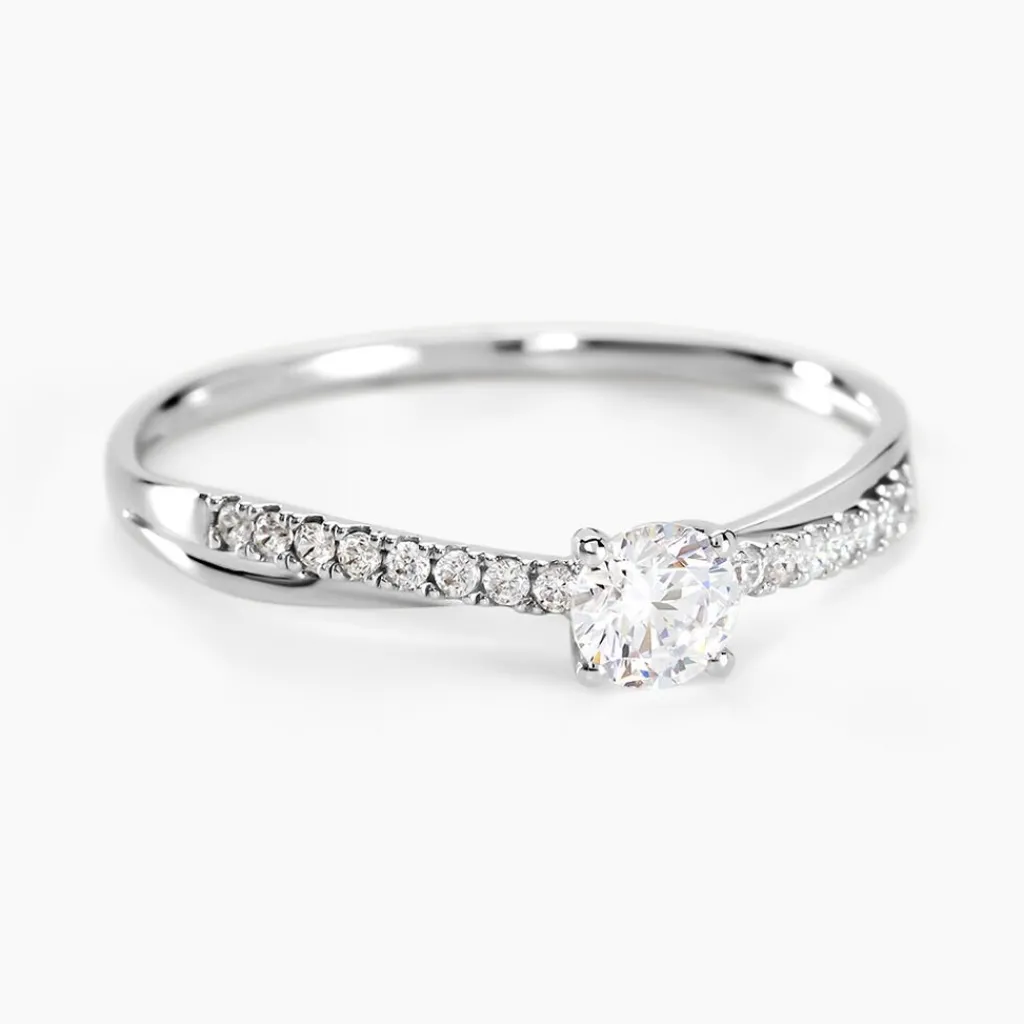 Bague Or Blanc 375/1000 Solitaire Accompagne Vague Oxydes De Zirconium