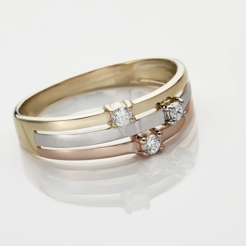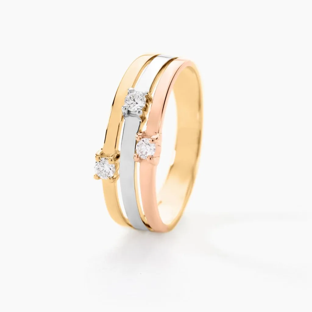 Bague Or Tricolore 375/1000 3 Anneaux 3 Diamants 0.1cts