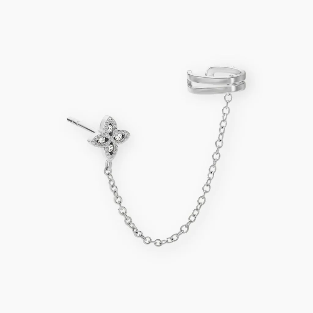 Bijou D’oreille Unitaire Argent Blanc 925/1000 Bague D’oreille Ajustable Et Fleur Pavage Oxydes Maille Forcat