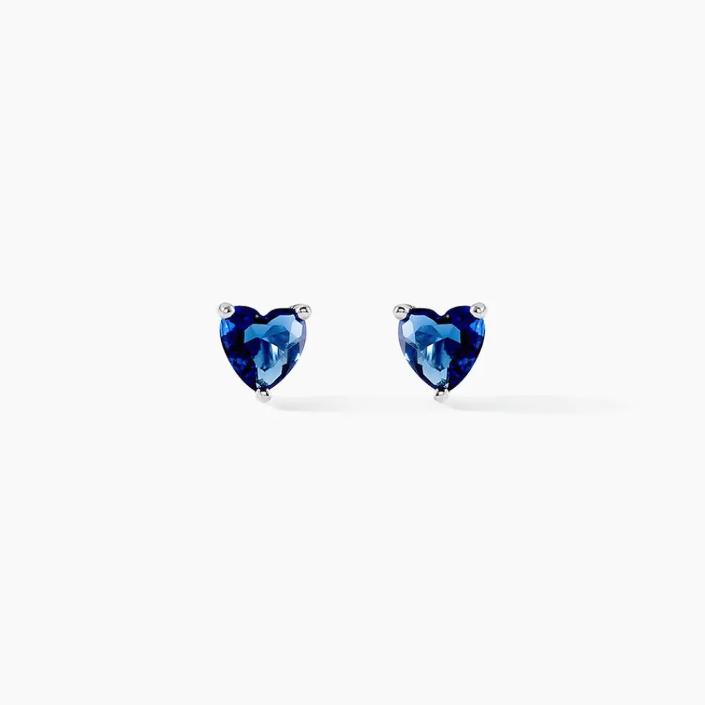 Boucles D’oreilles Puces Argent Blanc 925/1000 C艙urs Serti Griffes Oxydes De Zirconium Bleus