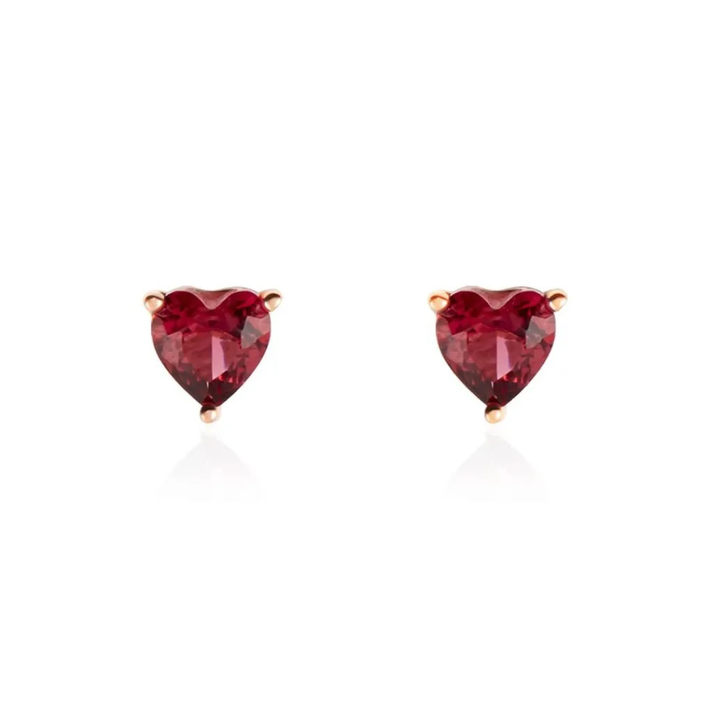 Boucles D’oreilles Puces Argent Rose 925/1000 C艙urs Serti Griffes Oxydes De Zirconium Rouges