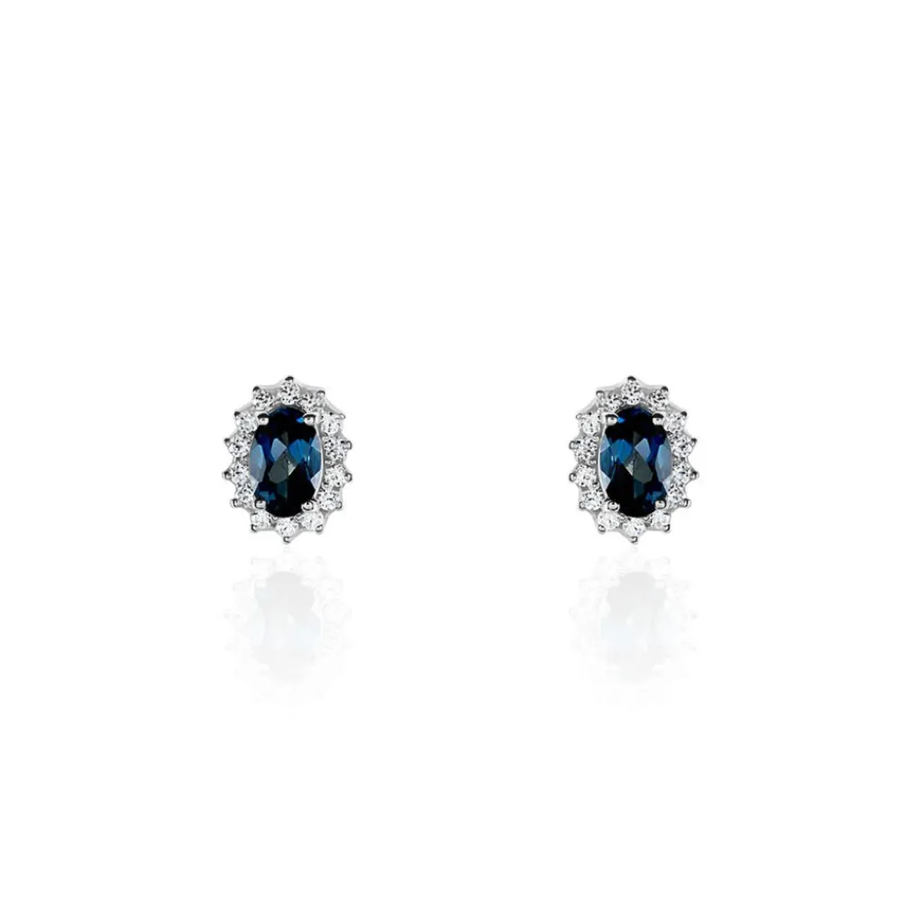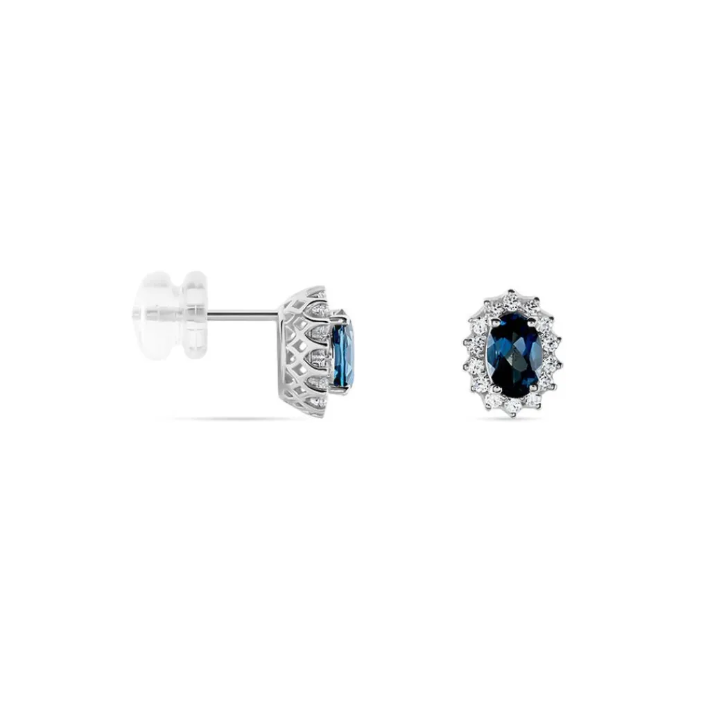 Boucles D’oreilles Or Blanc 375/1000 Marguerites Topazes London Blue Entourages Oxydes De Zirconium
