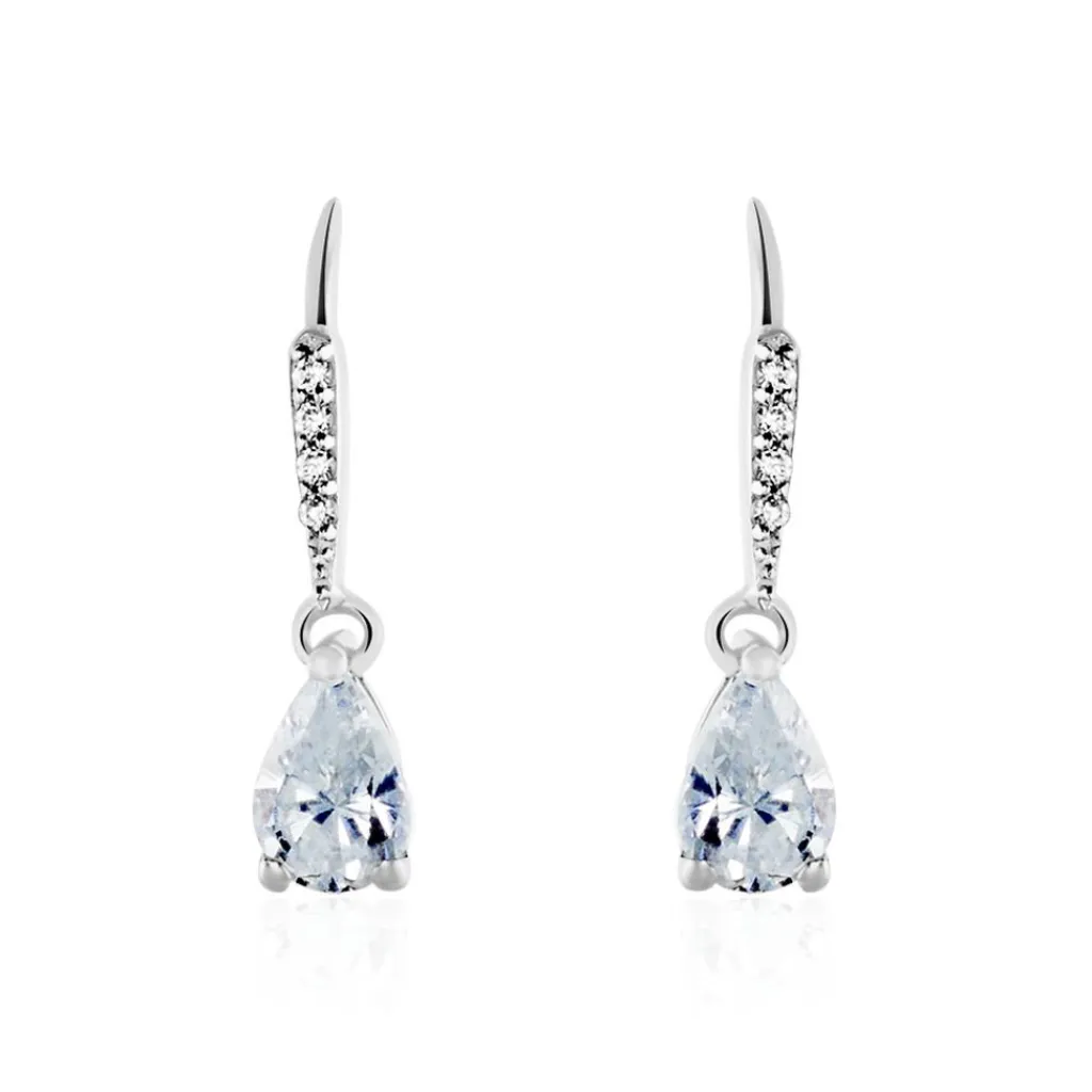 Boucles D’oreilles Or Blanc 375/1000 Montreal Oxyde De Zirconium Poire Accompagnée Oxydes De Zirconium