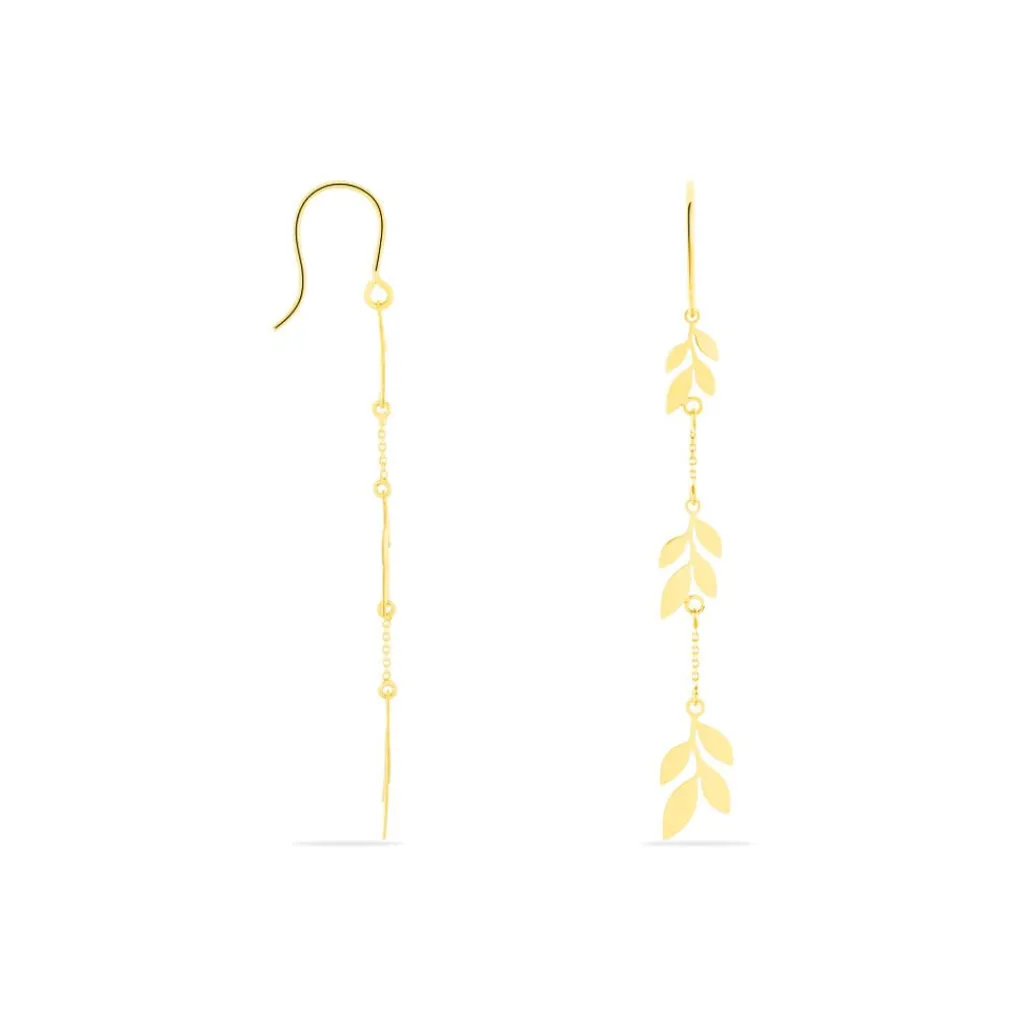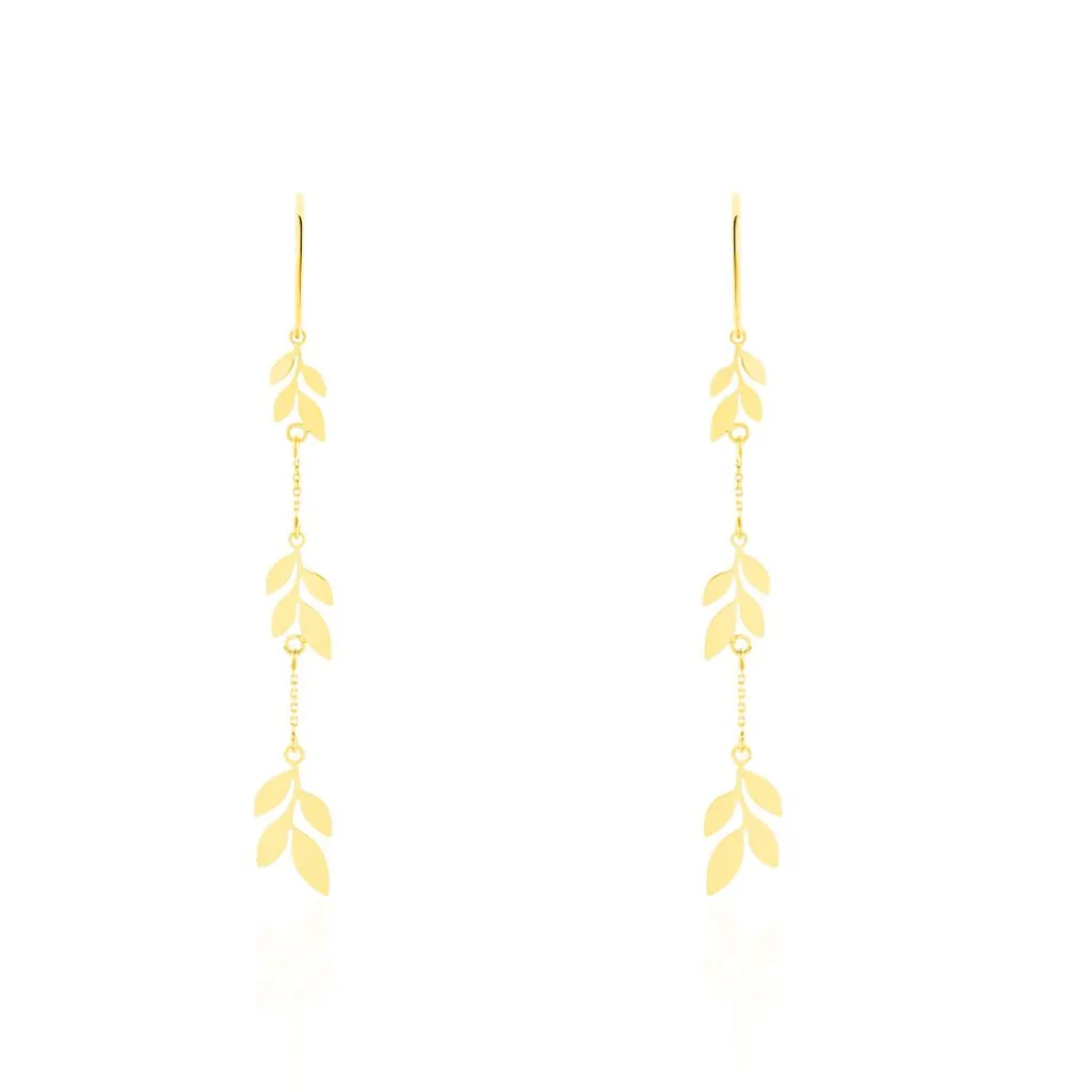 Boucles D’oreilles Or Jaune 375/1000 Pendantes Motif Feuille Chaine Maille Jaseron