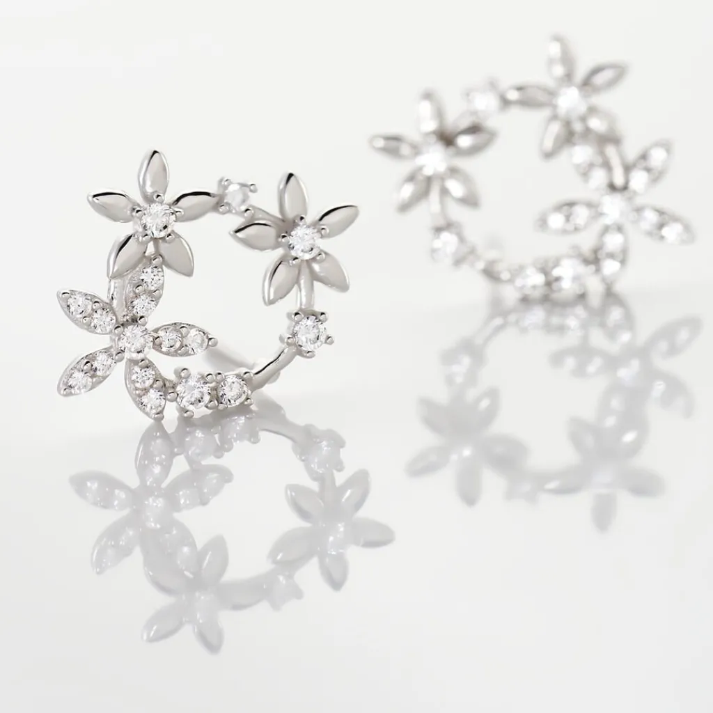 Boucles D’oreilles Argent Blanc 925/1000 Cercles Motifs Fleurs Semi Pavage Oxydes De Zirconium