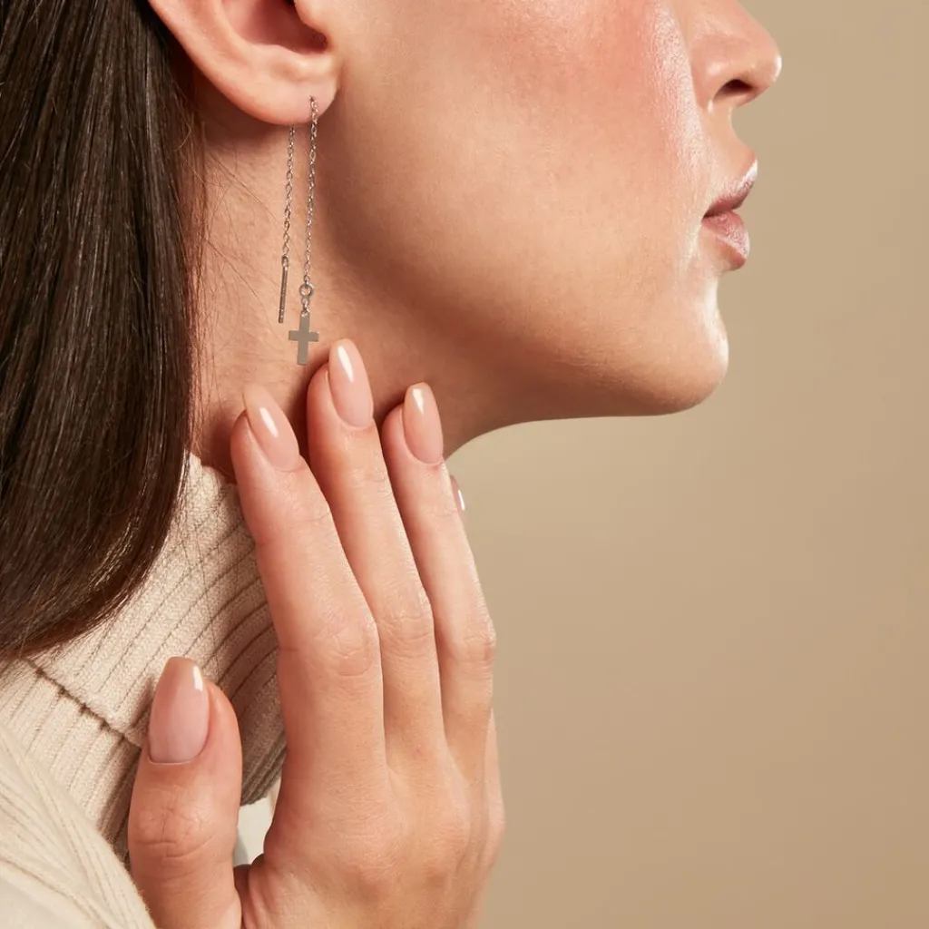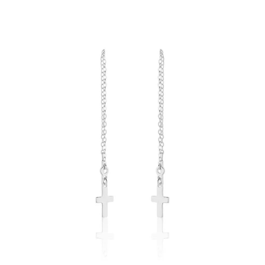 Boucles D’oreilles Pendantes Argent Blanc 925/1000 Croix Mailles Forçat 9.90cm