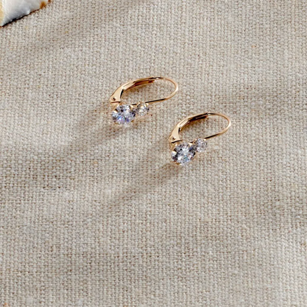 Boucles D’oreilles Or Jaune 375/1000 Dormeuses Double Oxydes De Zirconium