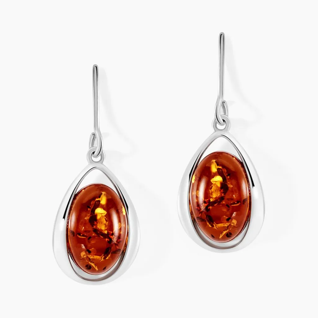 Boucles D’oreilles Argent Blanc 925/1000 Formes Gouttes Ambre Cognac