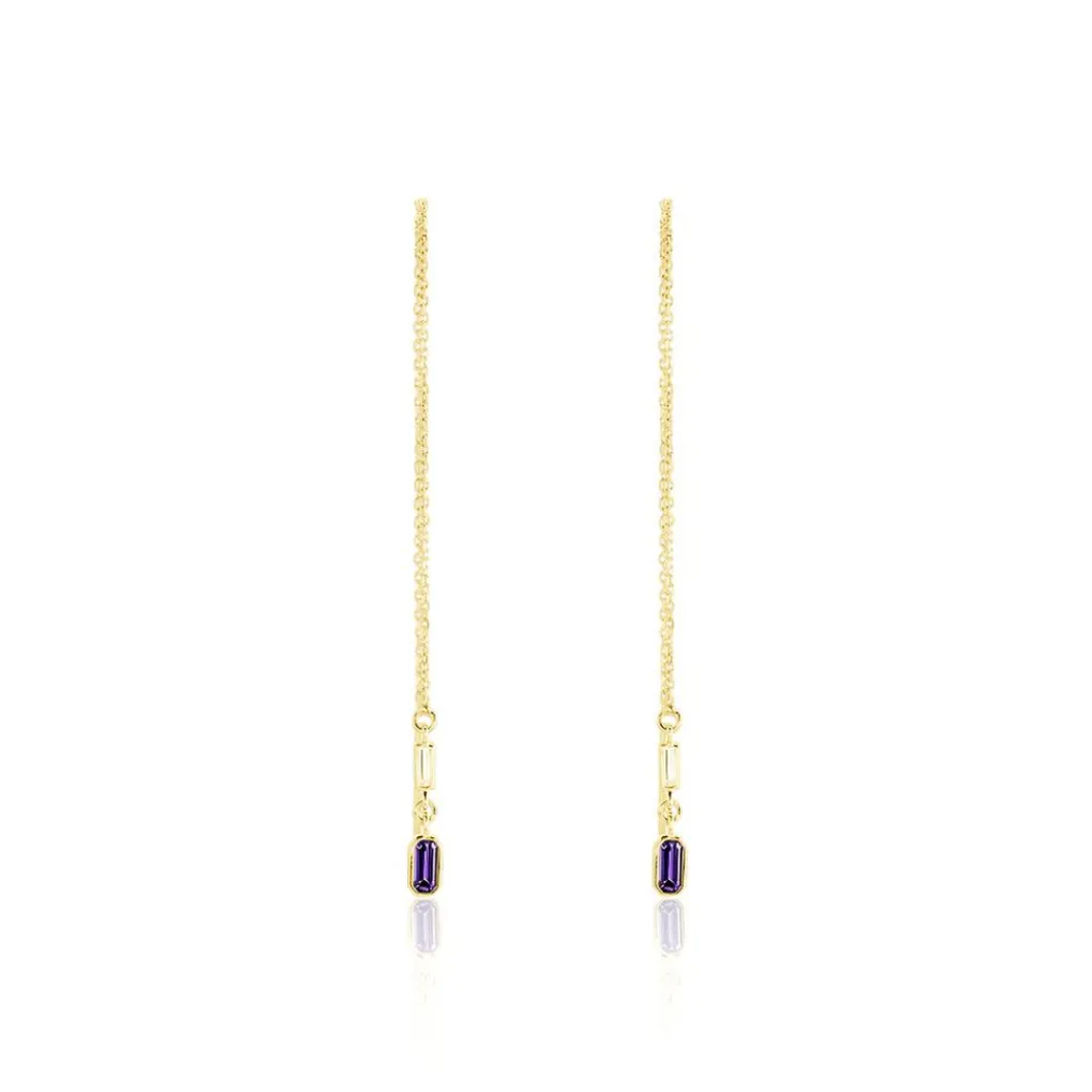 Boucles D’oreilles Or Jaune 375/1000 Double Pendantes Forme Rectangle & Octogone Topaze & Amethyste Chaine Maille Forçat
