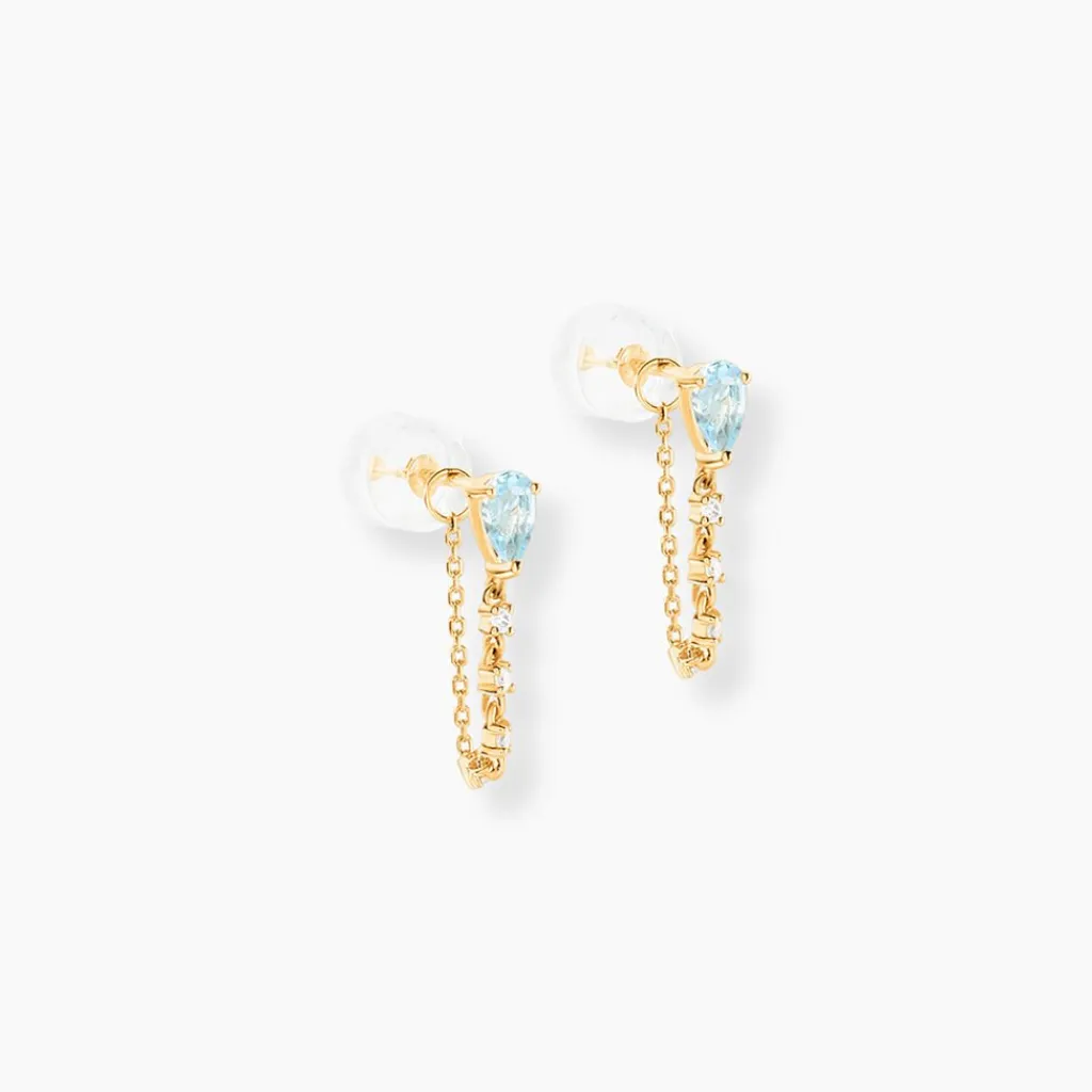 Boucles D’Oreilles Pendantes Or Jaune 375/1000 Chaine Goutte Topaze Bleu Sky Sertis 3 Griffes Accompagnees Oxyde De Zirconium