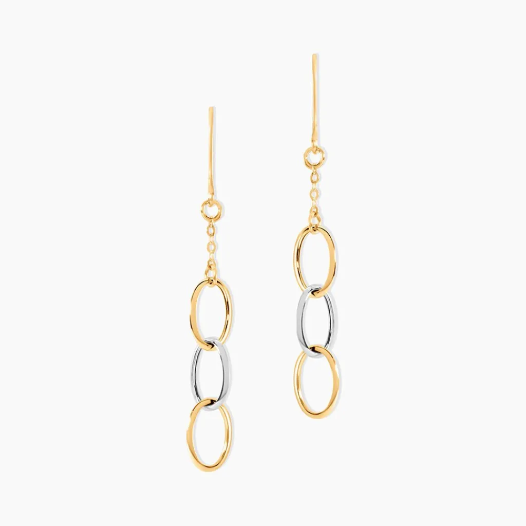 Boucles D’oreilles Or Bicolore 375/1000 Chaine Forçat Or Jaune Et 3 Eléments Ovales Or Blancs Et Or Jaune Alternes