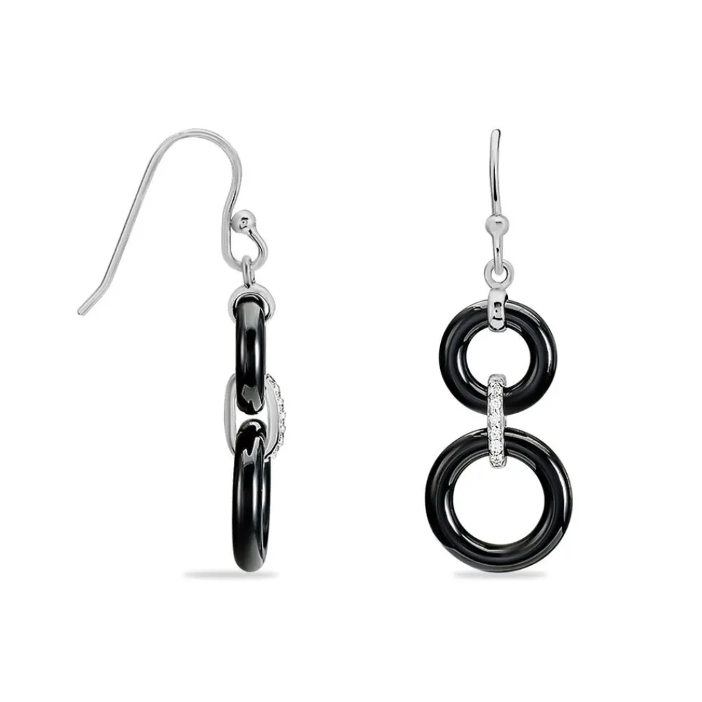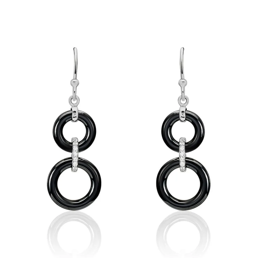 Boucles D’oreilles Argent Blanc 925/1000 Cercles Ceramique Noire Et Liens Paves Oxydes De Zirconium
