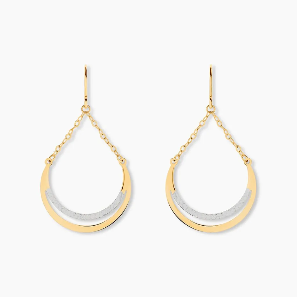 Boucles D’Oreilles Pendantes Bicolore Or 375/1000 Gouttes Ajourees Avec Chaine Forcat