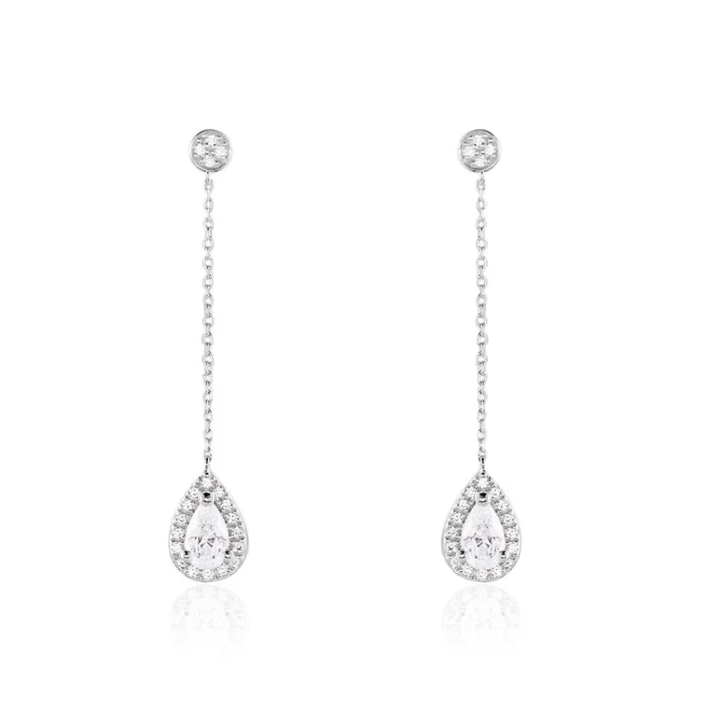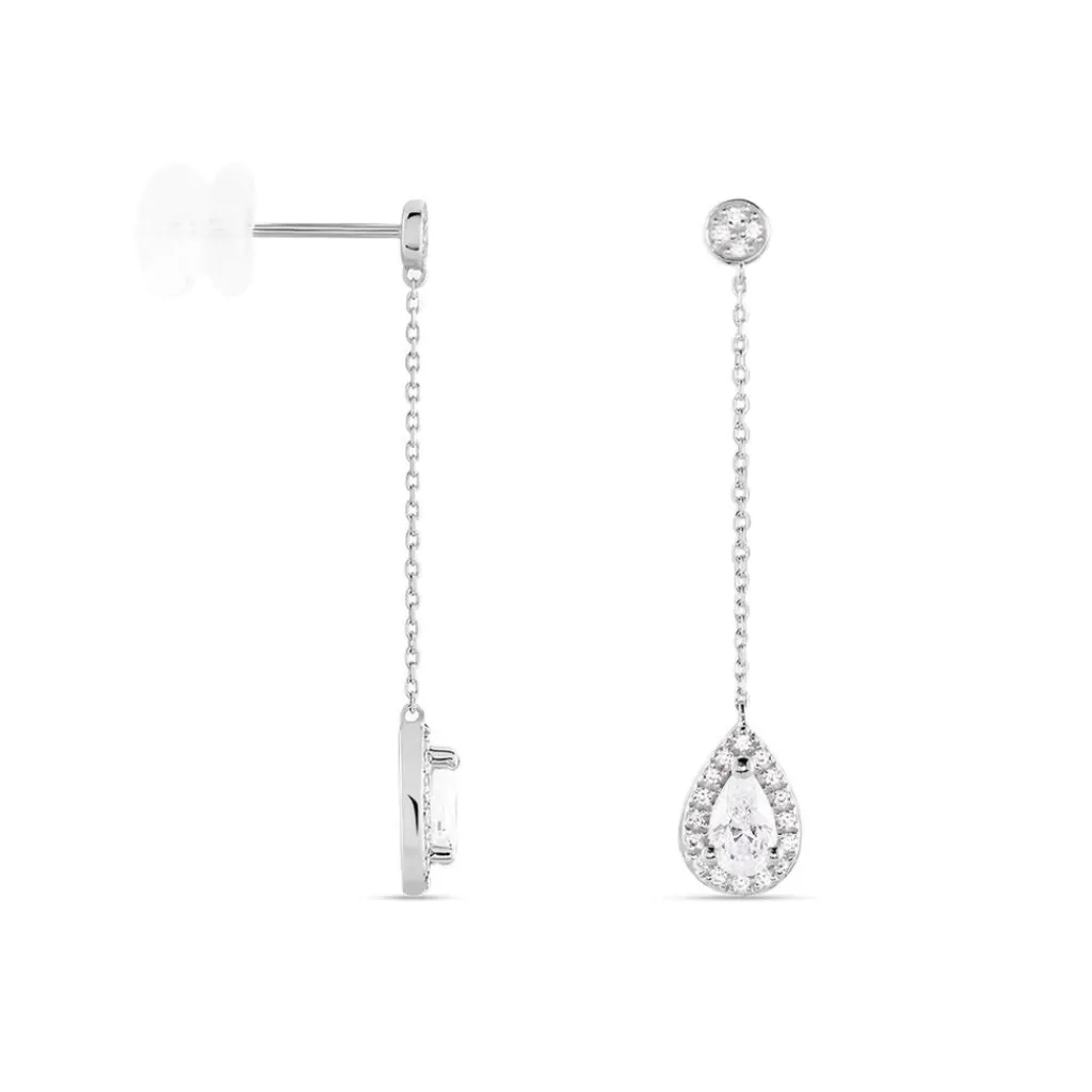 Boucles D’oreilles Pendantes Or Blanc 375/1000 Goutte Pendante Entourage Oxyde De Zirconium Maille Forçat 42cm