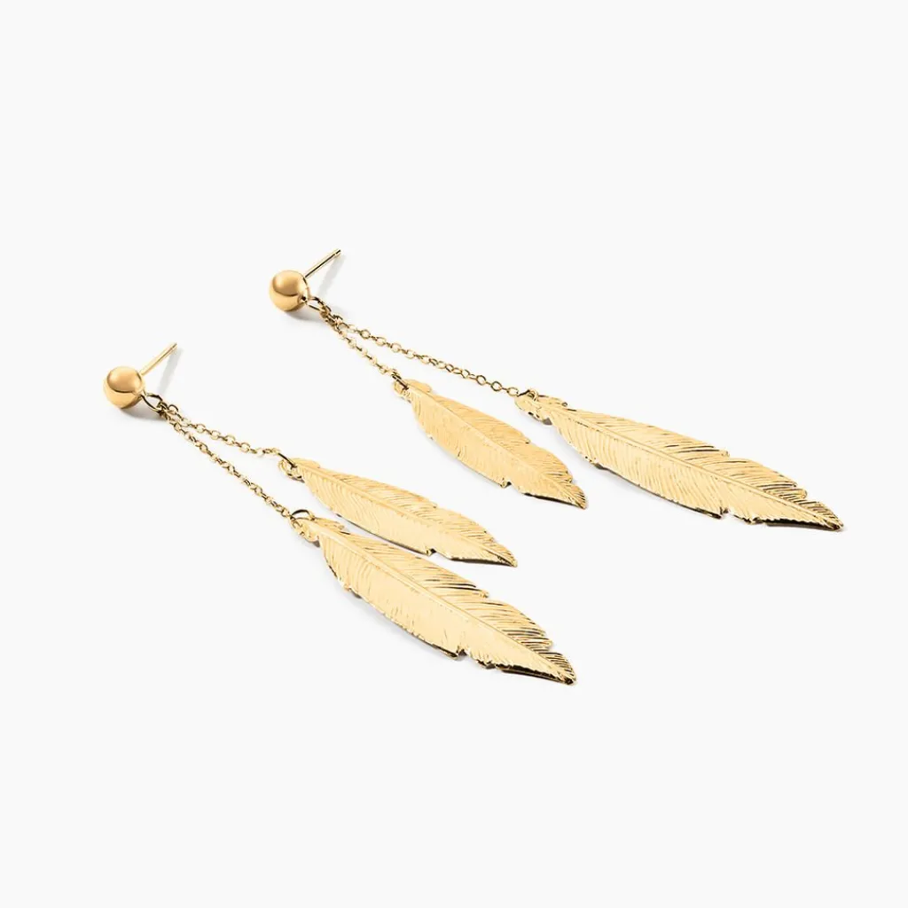Boucles D’oreilles Pendantes Or Jaune 375/1000 Double Plumes Sur Chaines Forcat