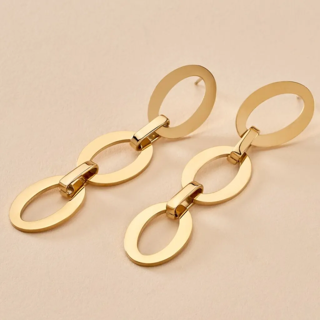 Boucles D’oreilles Pendantes Acier Inoxydable Jaune 3 Maillons Juxtaposes 6.4cm