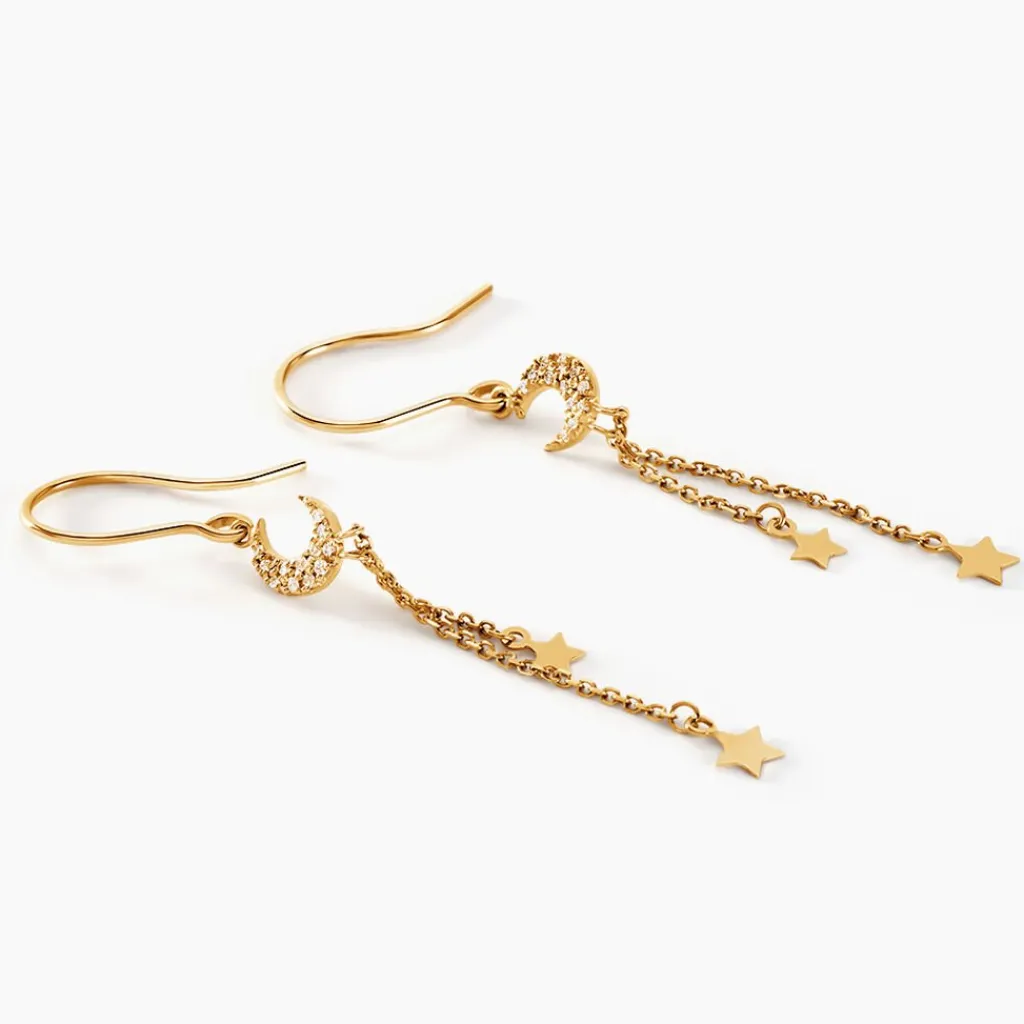 Boucles D’oreilles Pendantes Or Jaune 375/1000 Pampilles Lunes Et Etoiles Oxyde De Zirconium Blanc Serti Pavage