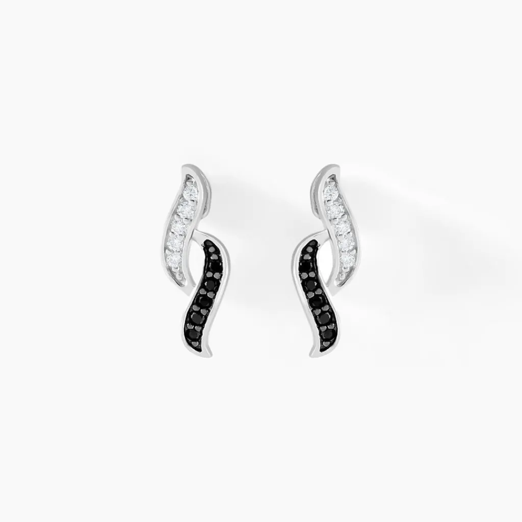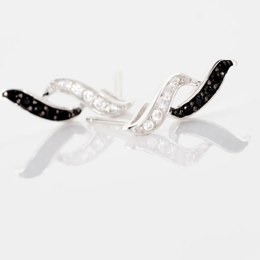 Boucles D’oreilles Argent Blanc 925/1000 Vagues Oxydes De Zirconium Noirs Et Blancs