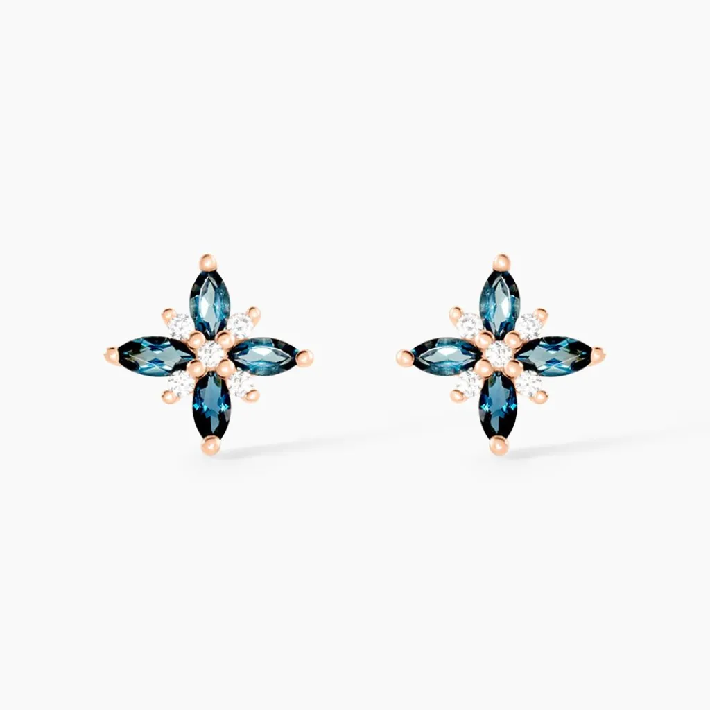 Boucles D’oreilles Puces Or Rose 375/1000 Motif Fleur Topaze Bleu London Sertis Griffes Oxydes De Zirconium Blanc