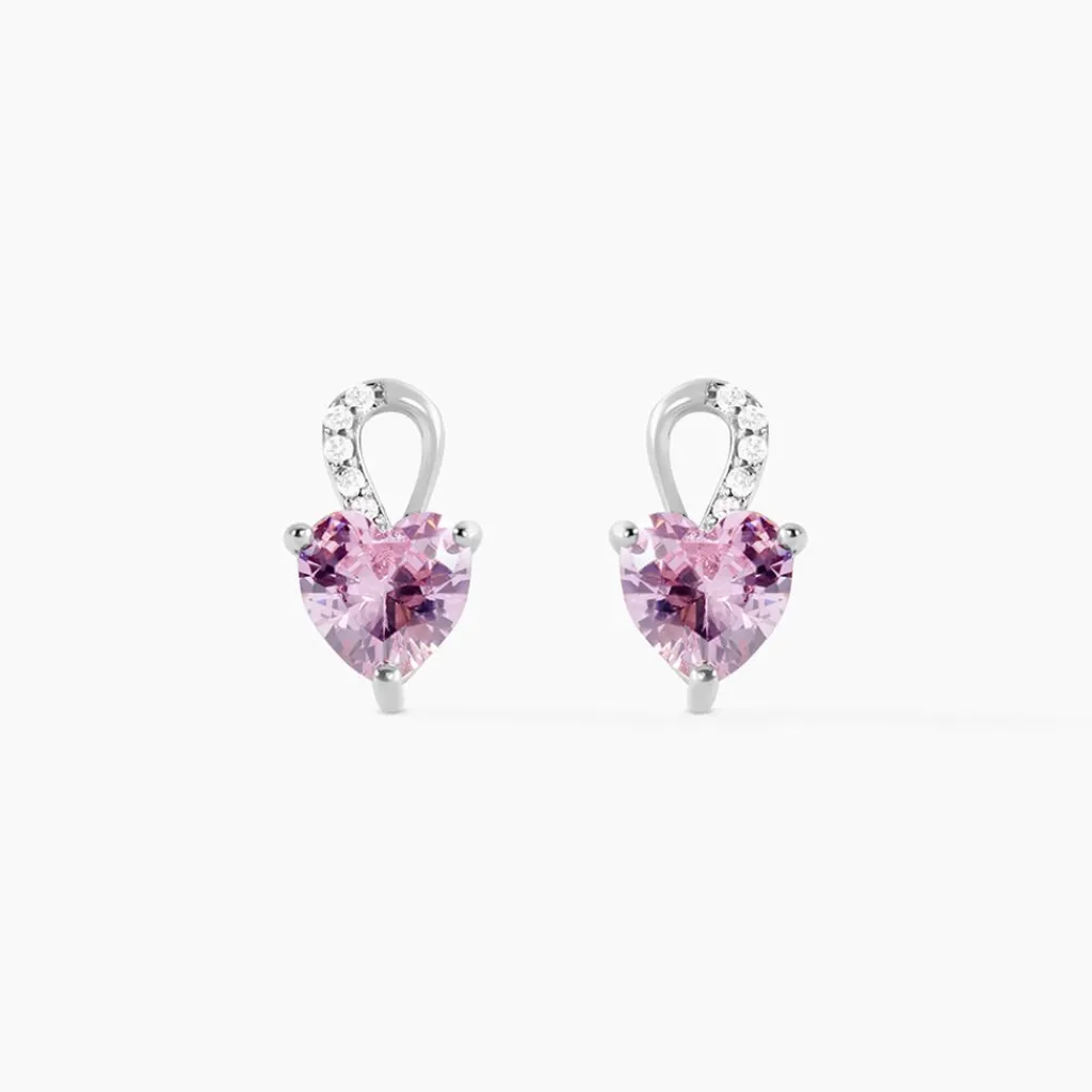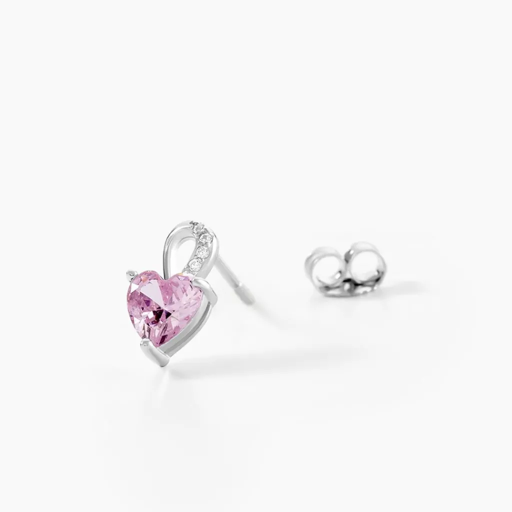 Boucles D’oreilles Puces Argent Blanc 925/1000 Coeur Rose Serti Griffes Accompagne Oxydes De Zirconium