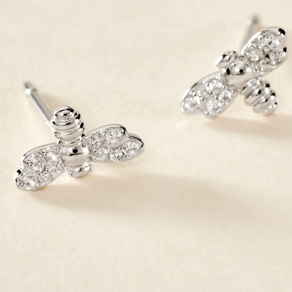 Boucles D’oreilles Puces Argent Blanc 925/1000 Abeilles Pavage Oxydes De Zirconium