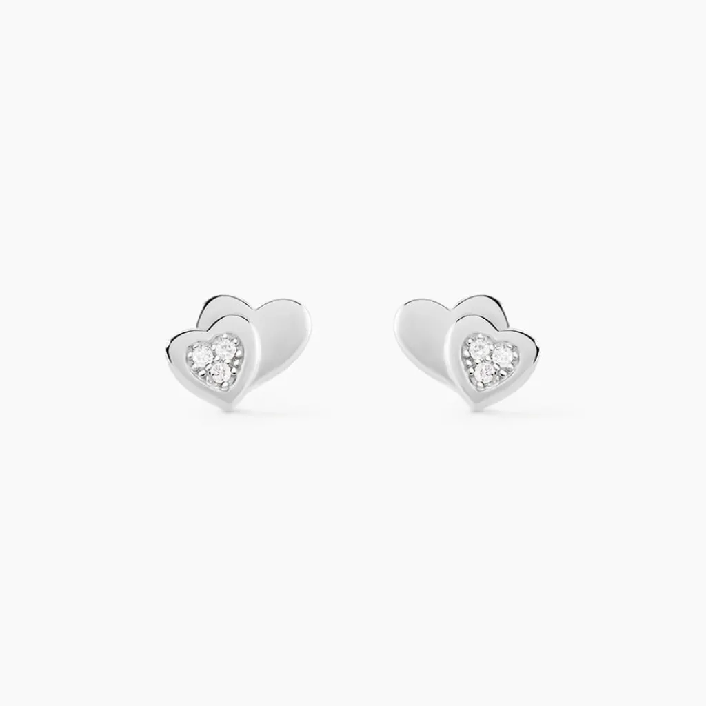 Boucles D’oreilles Puces Argent Blanc 925/1000 Double C艙ur Pavage Oxydes De Zirconium